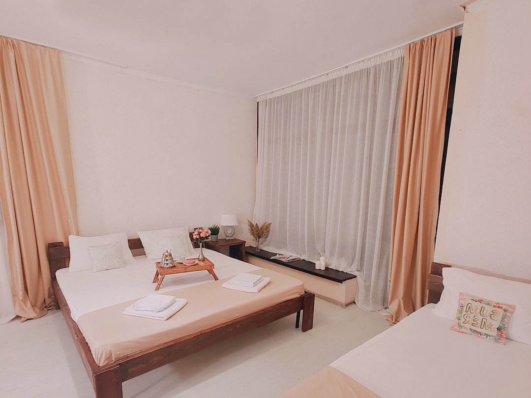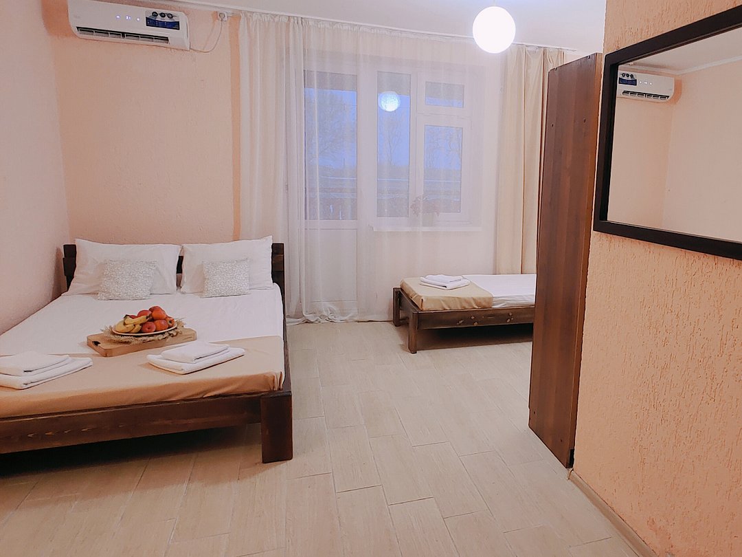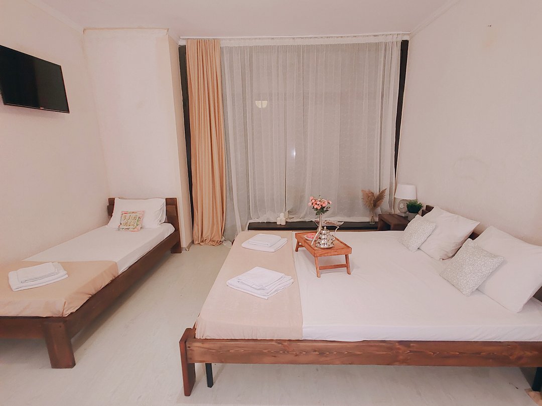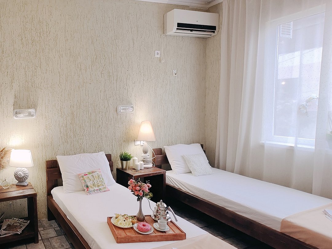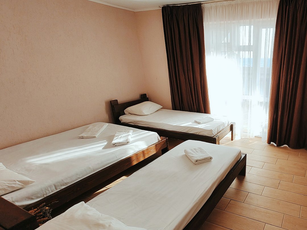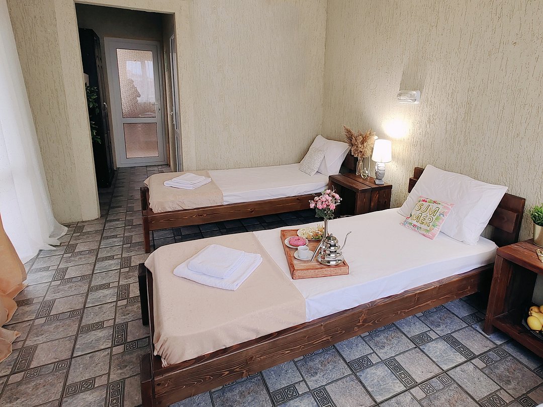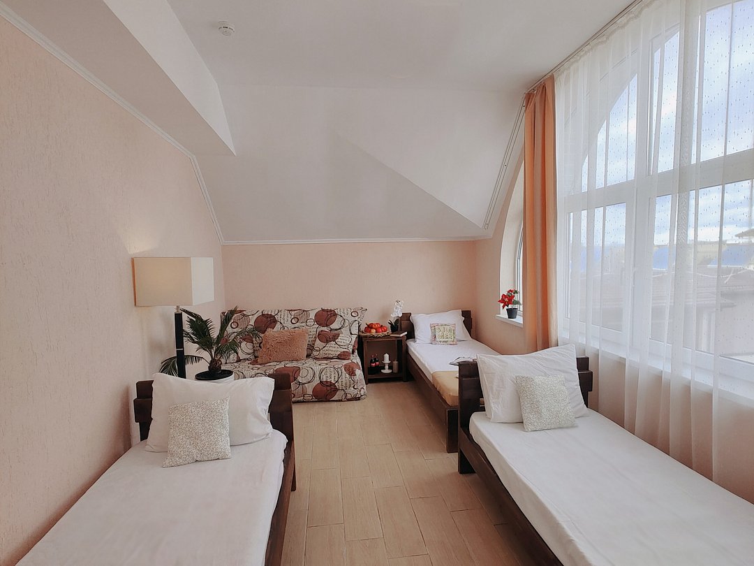 Номер оснащен: двуспальная кровать и односпальная кровать ,шкаф, телевизор, кондиционер, мини-холодильник, чайник.
