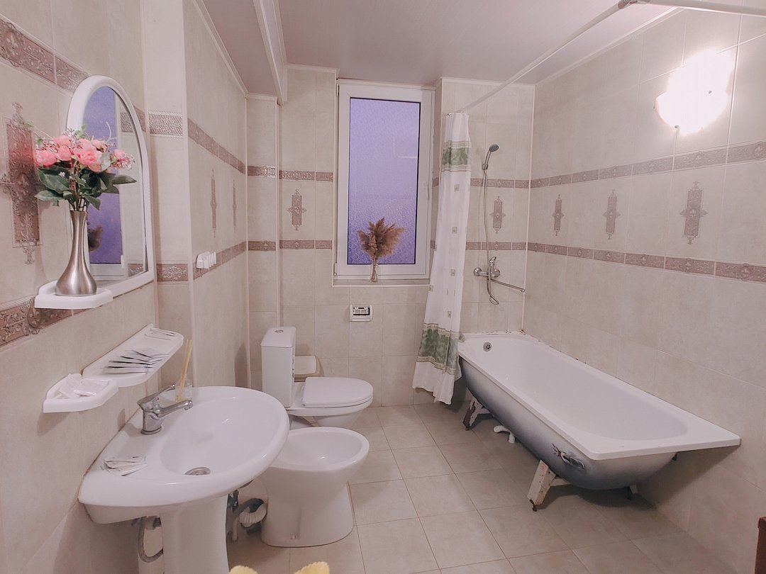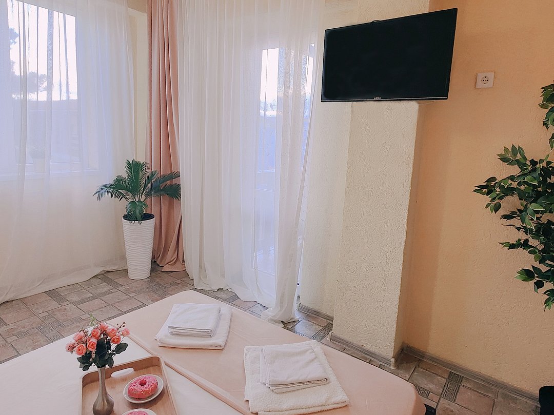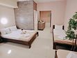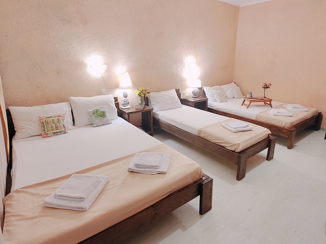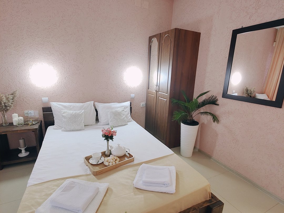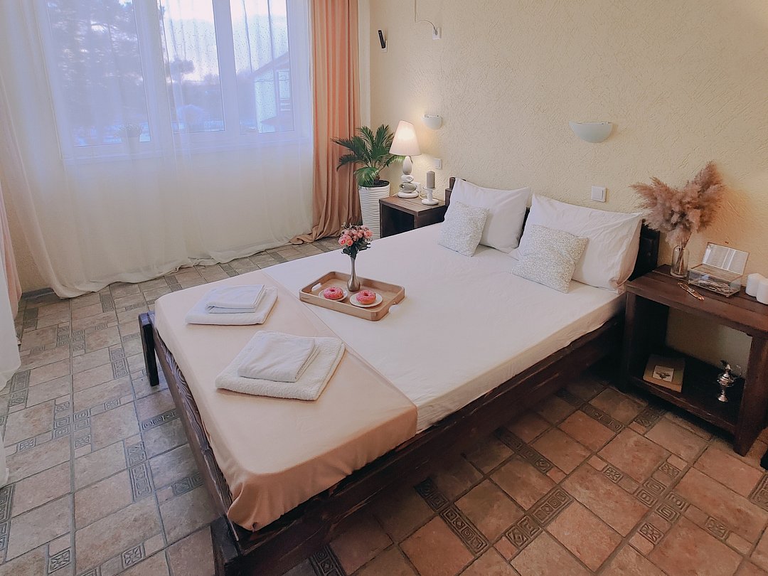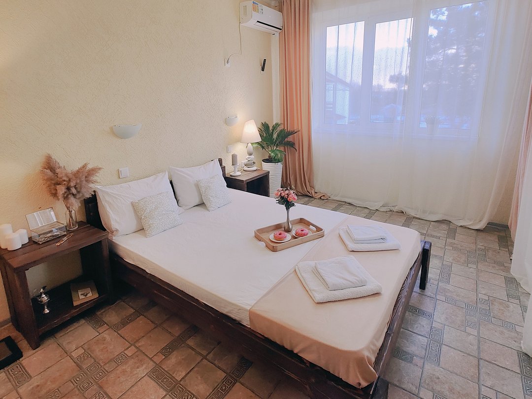 Номер оснащен: двуспальная кровать и односпальная кровать ,шкаф, телевизор, кондиционер, мини-холодильник, чайник.