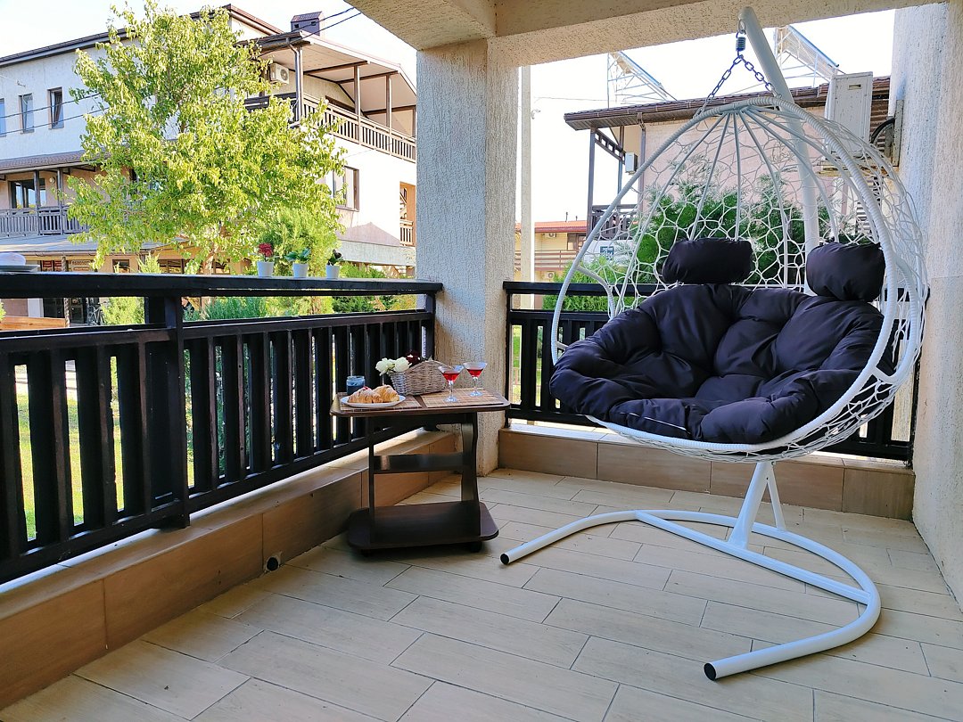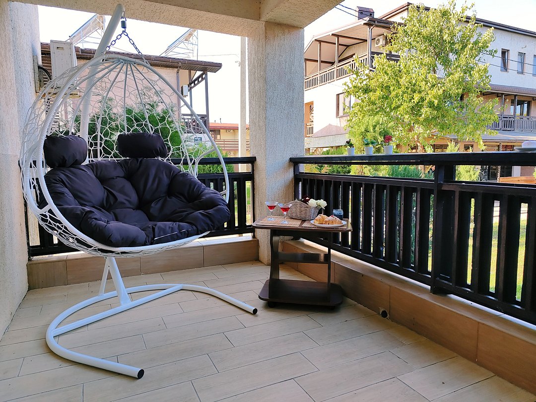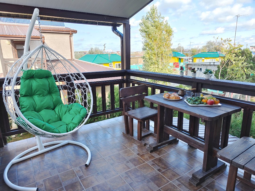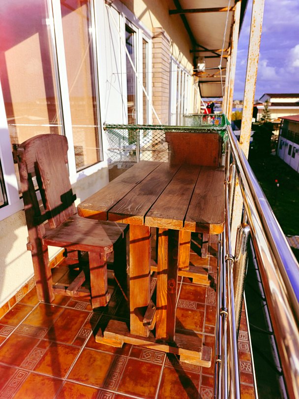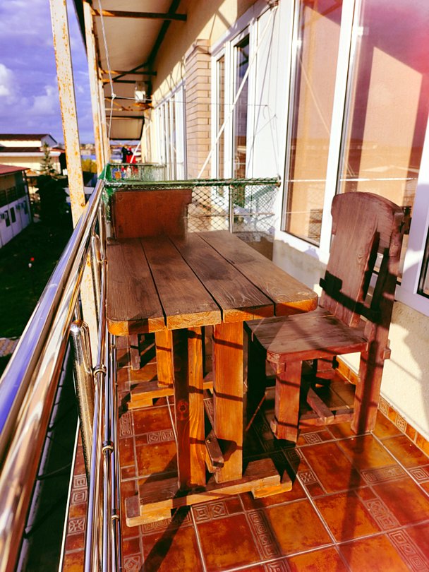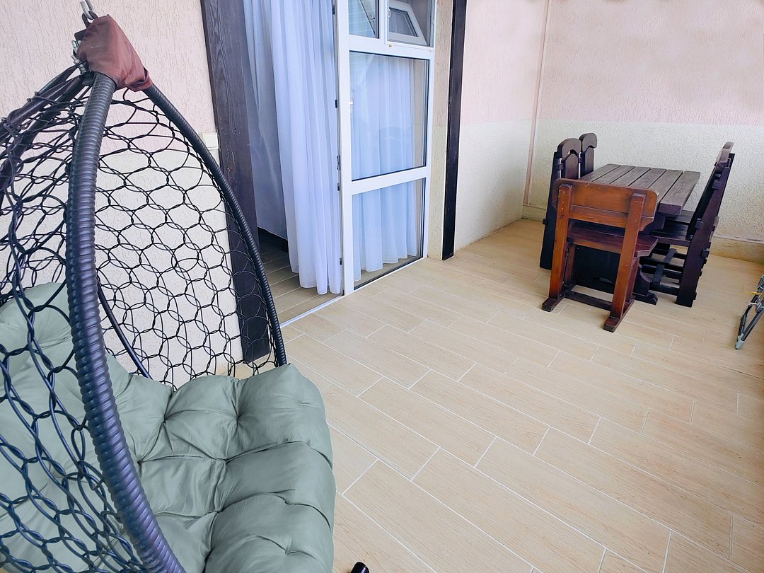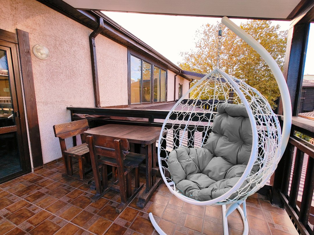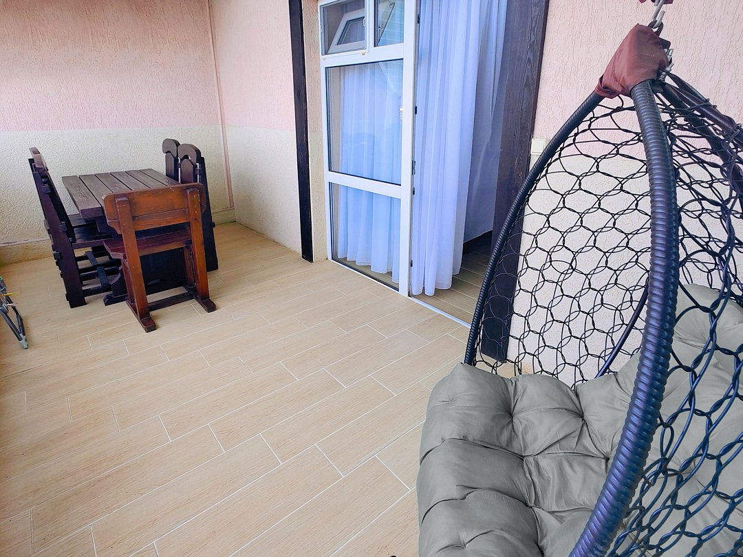 На балконе имеется: кресло-кокон, стол, стулья.