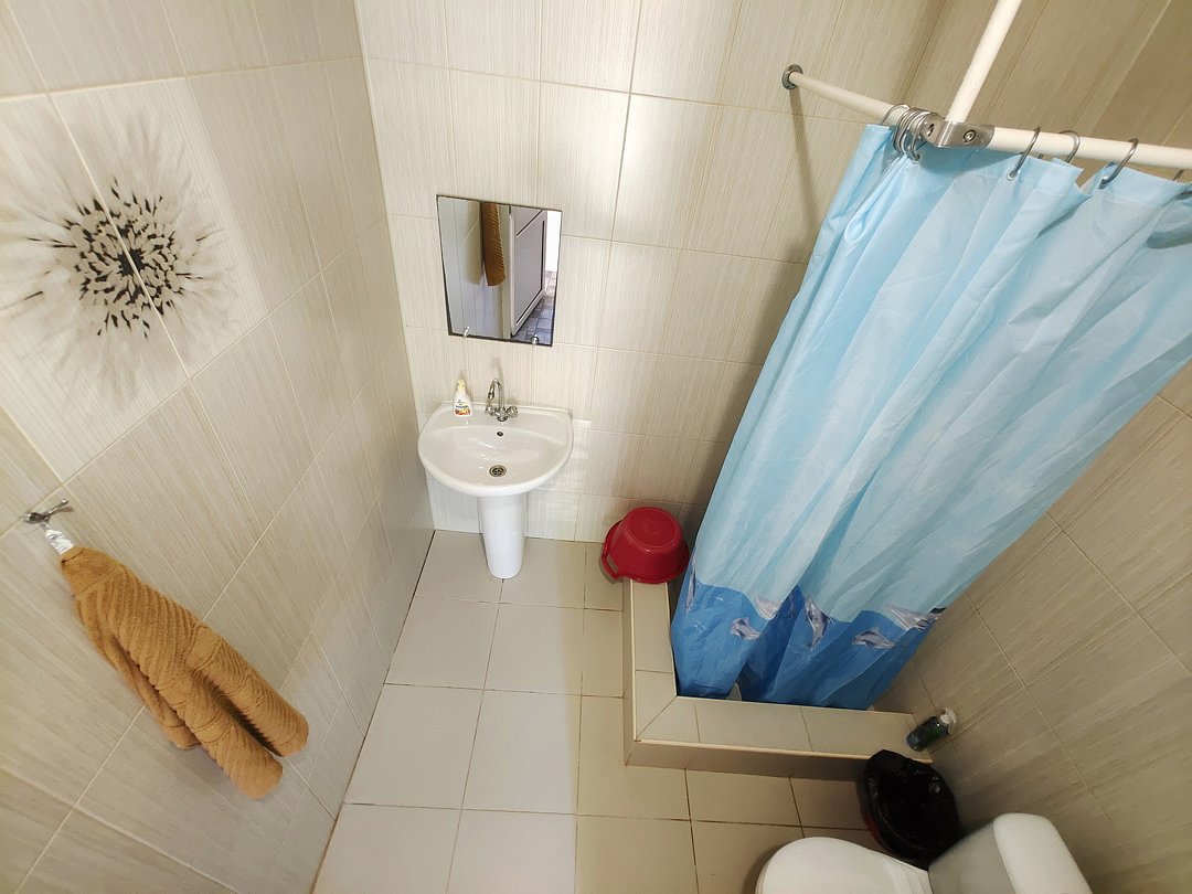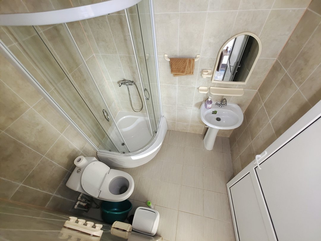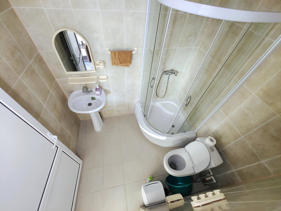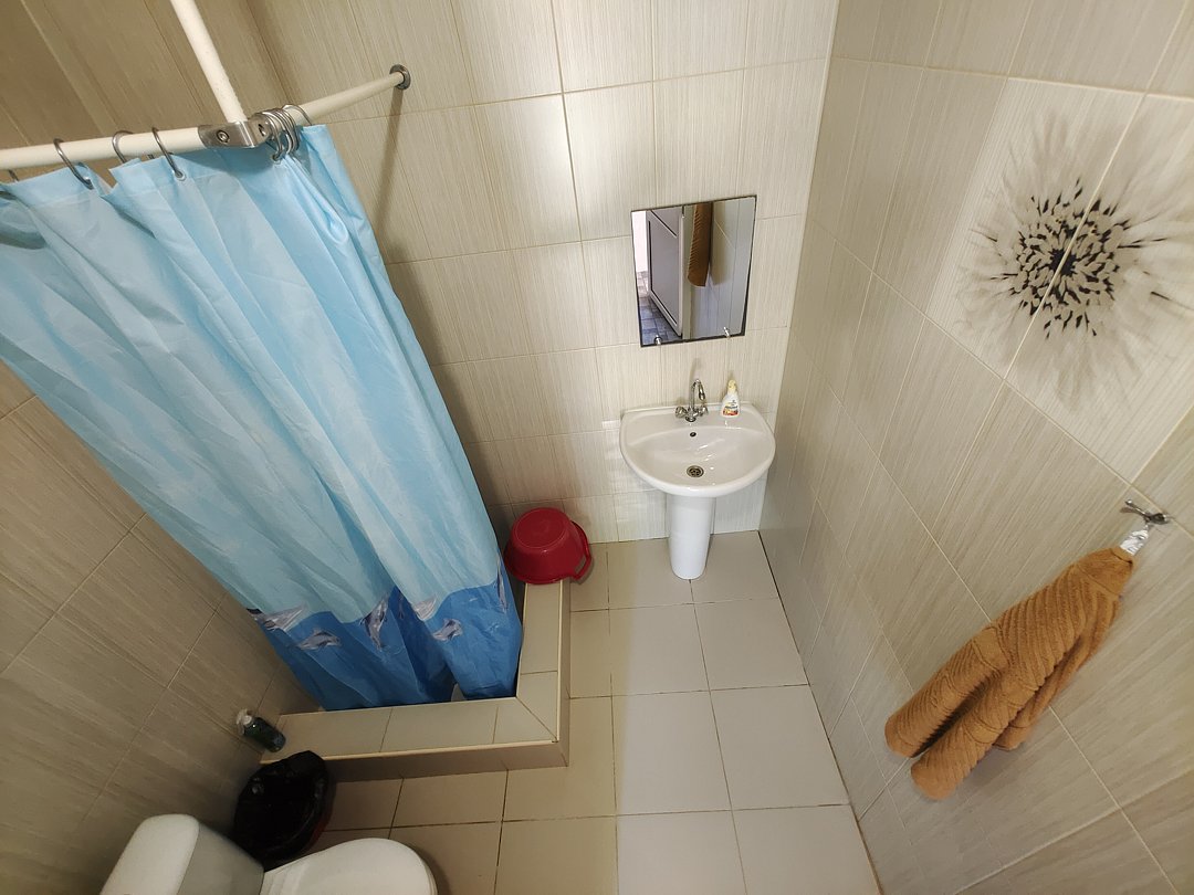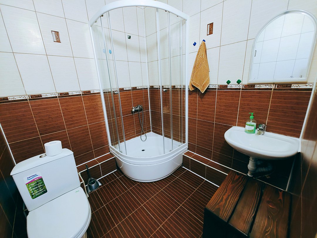 Ванная комната- душ, раковина, зеркало, туалет.