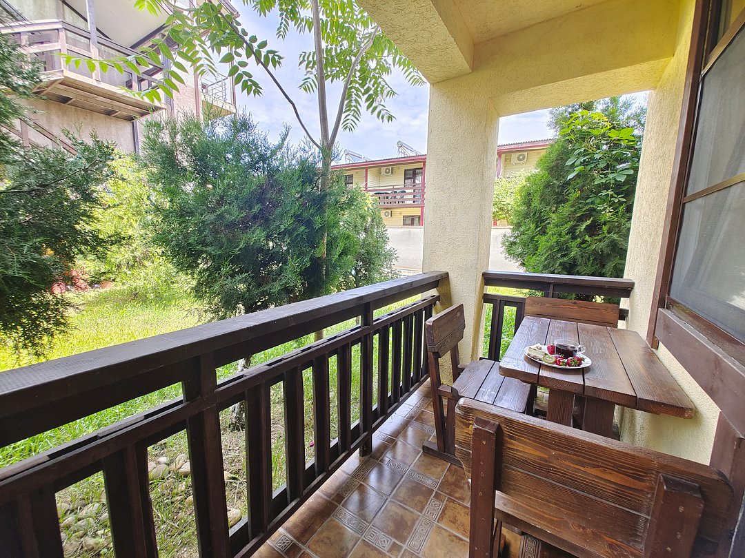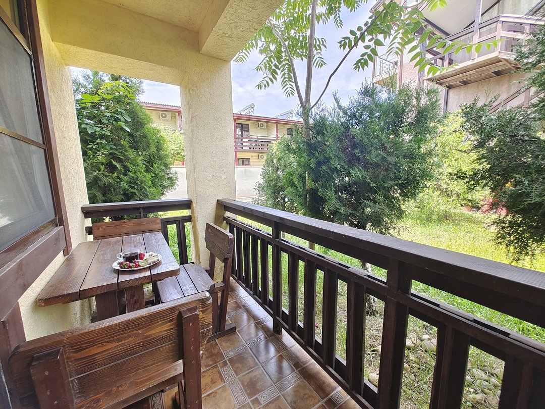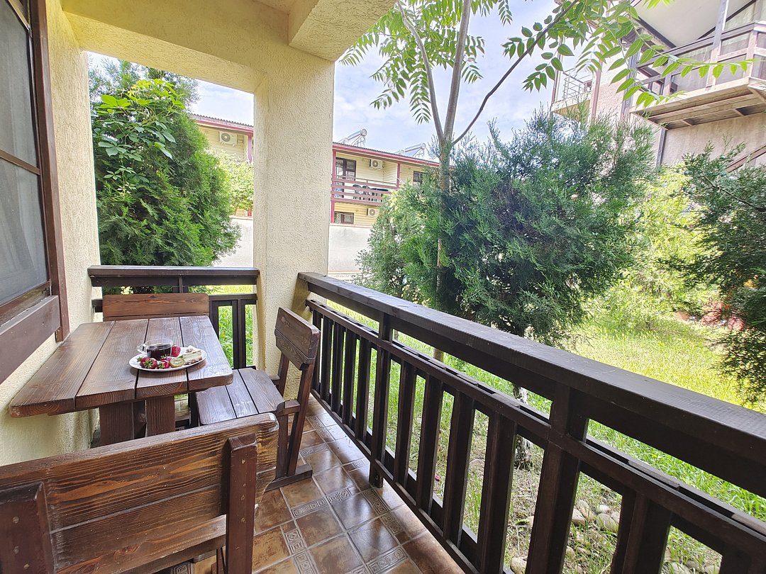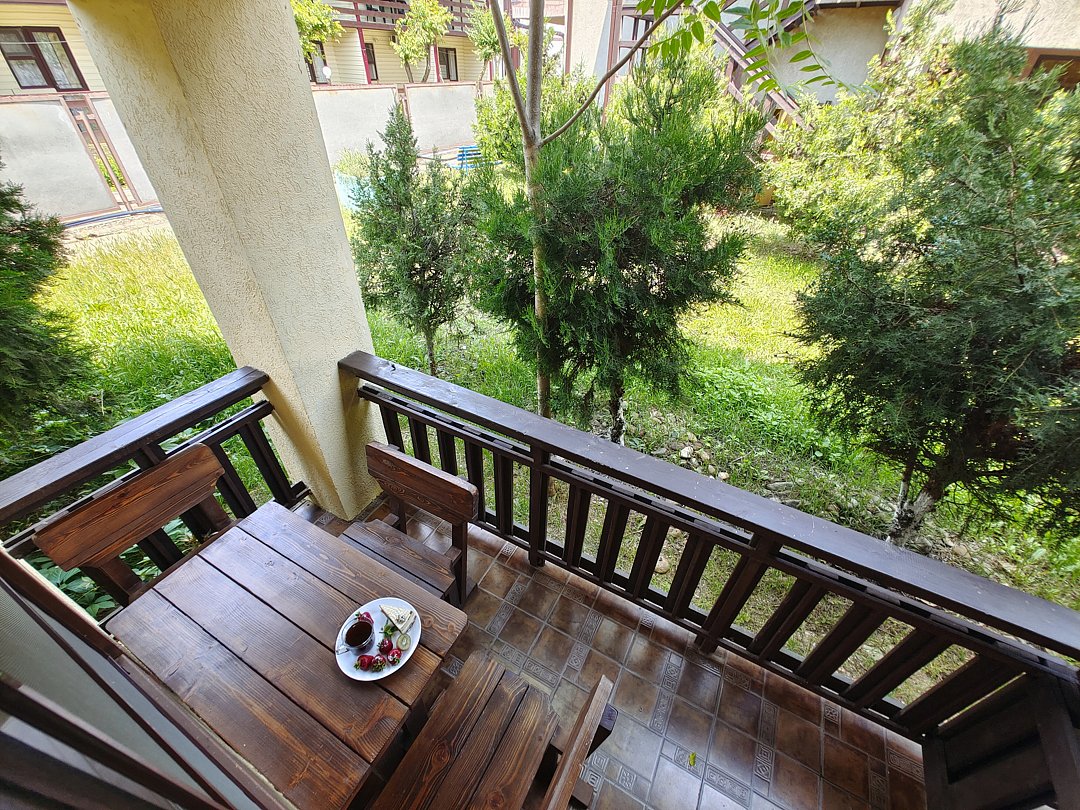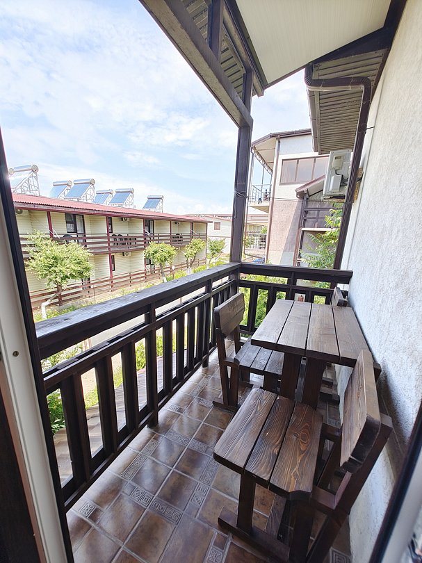 В номере имеется балкон с обеденной зоной и видом на территорию.
