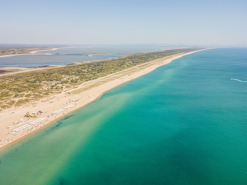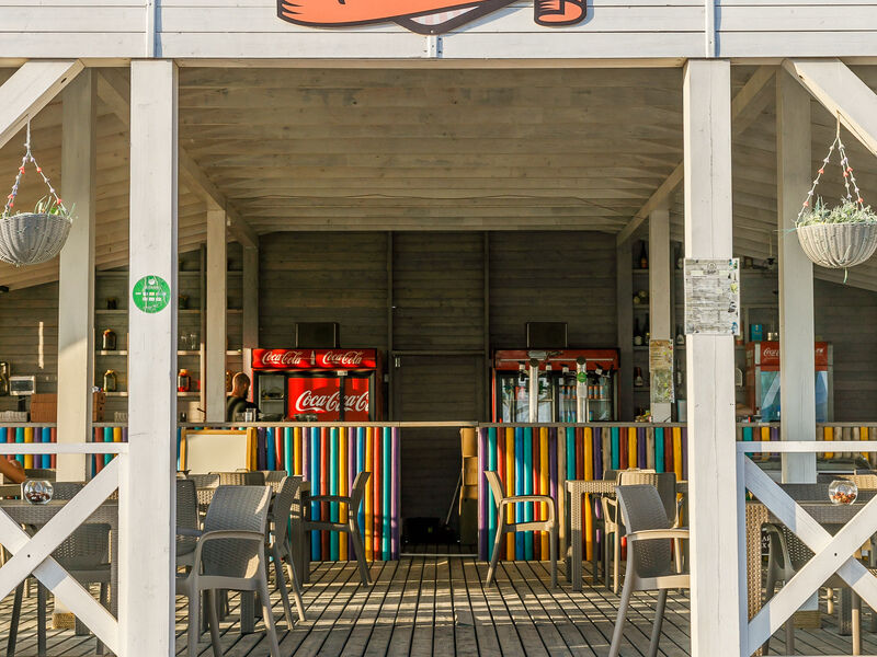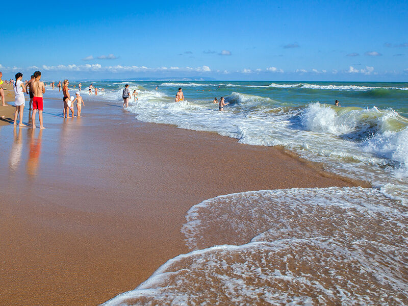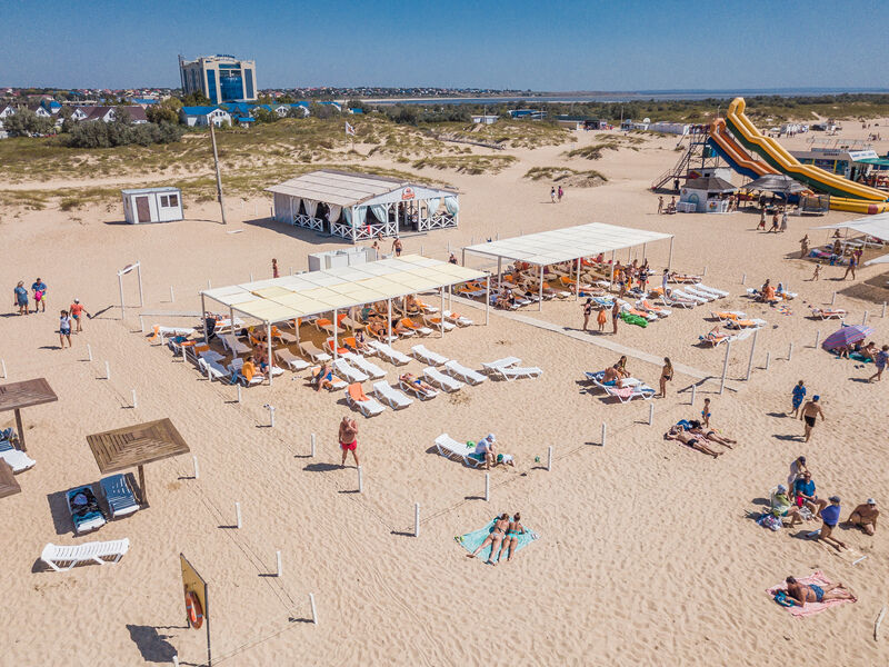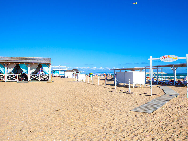 Ближайший песчаный пляж в 150 метрах от жилого корпуса огорожен и благоустроен. На нем есть все необходимое для полноценного отдыха: раздевалки, теневые навесы, шезлонги и пляжные полотенца. Работает кафе.
