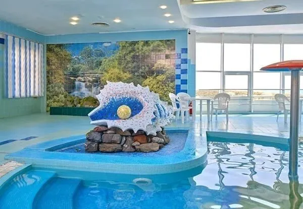 Тип бассейна: крытый бассейн, детский бассейнВода в бассейне: подогреваемый бассейнРядом с бассейном: шезлонгиВремя работы: от 10:00 до 22:00Наряду со взрослым бассейном с панорамным видом на морские пейзажи, здесь также расположился очаровательный детский бассейн, где малыши могут наслаждаться плесканием под водопадом-грибочком.