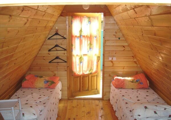 Для размещения гостям предлагаются деревянные домики с цветными крышами и удобствами на улице. Проживание на турбазе возможно с июня по сентябрь.