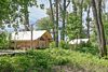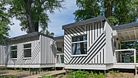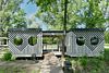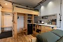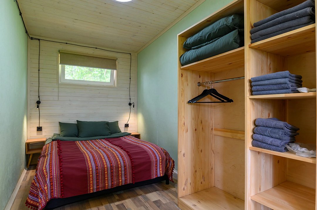 Гостевой дом включает в себя спальную зону с одной двуспальной кроватью и односпальной кроватью на втором ярусе, гардеробную, мини-кухню и панорамные окна с видом на водную гладь или лес.
