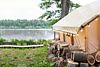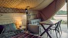Комфортабельная палатка включает в себя спальную зону с тремя кроватями и диваном, гардеробной, мини-кухню и террасу с видом на водную гладь.