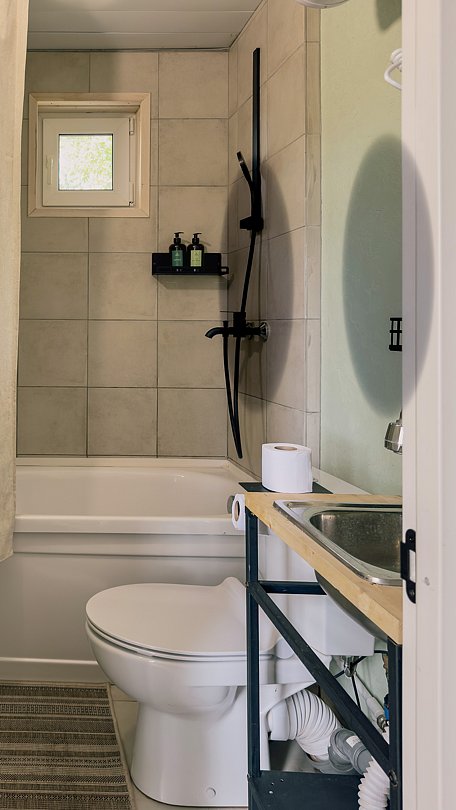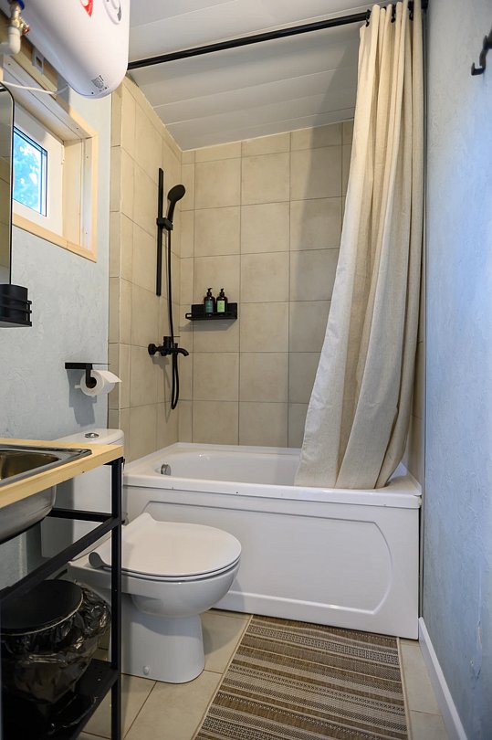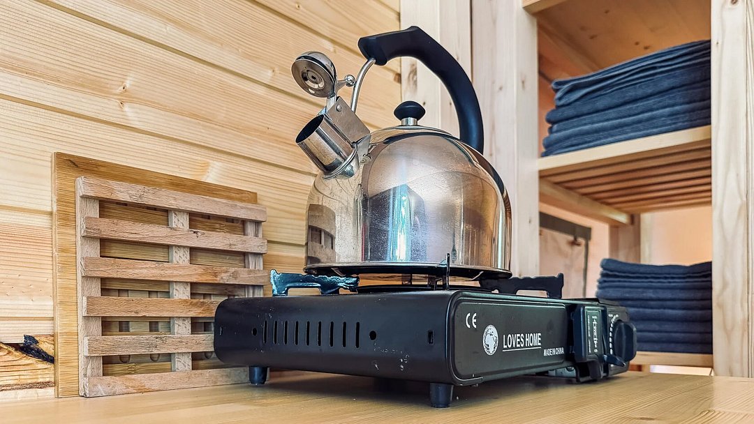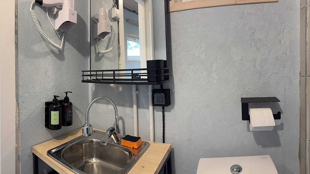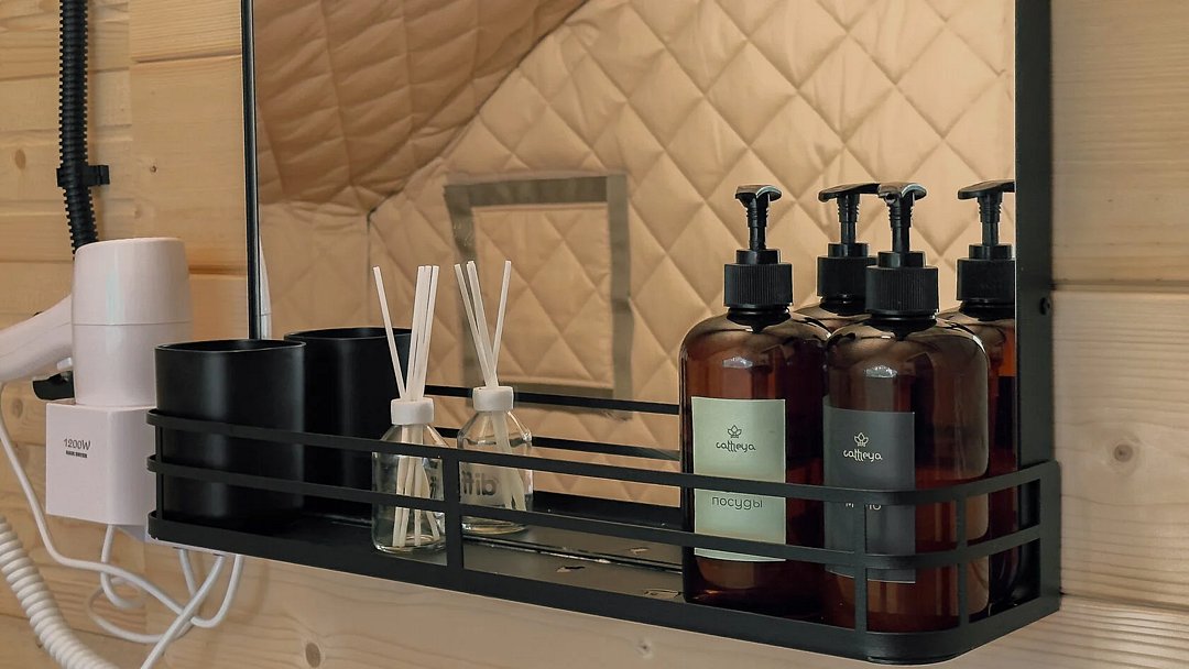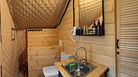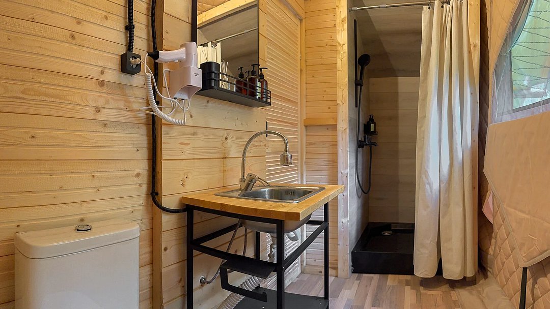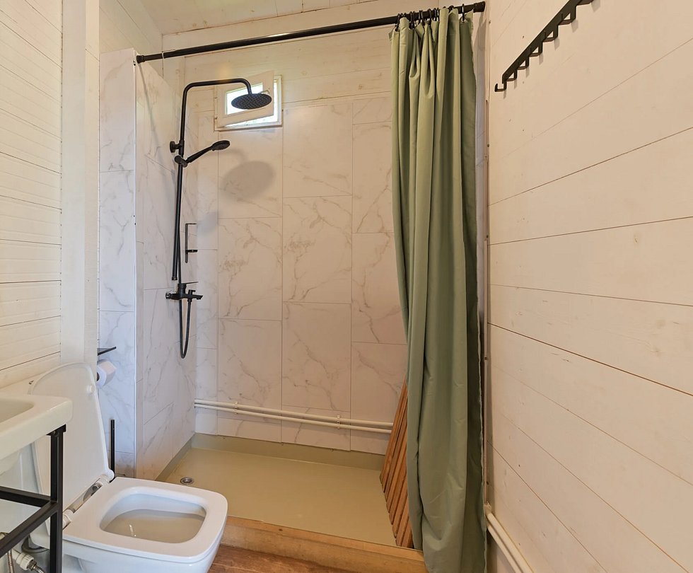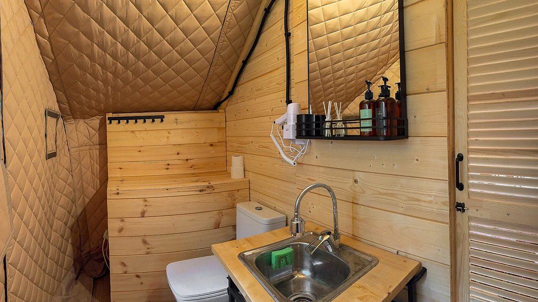 Санузел с душевой кабинкой и туалетом находится прямо в номере. Оснащение номеров глэмпинга: электричество, обогреватели, электрический чайник, газовая комфорка, мини-холодильник, мини-кухня, набор посуды, полотенца, фен по требованию.