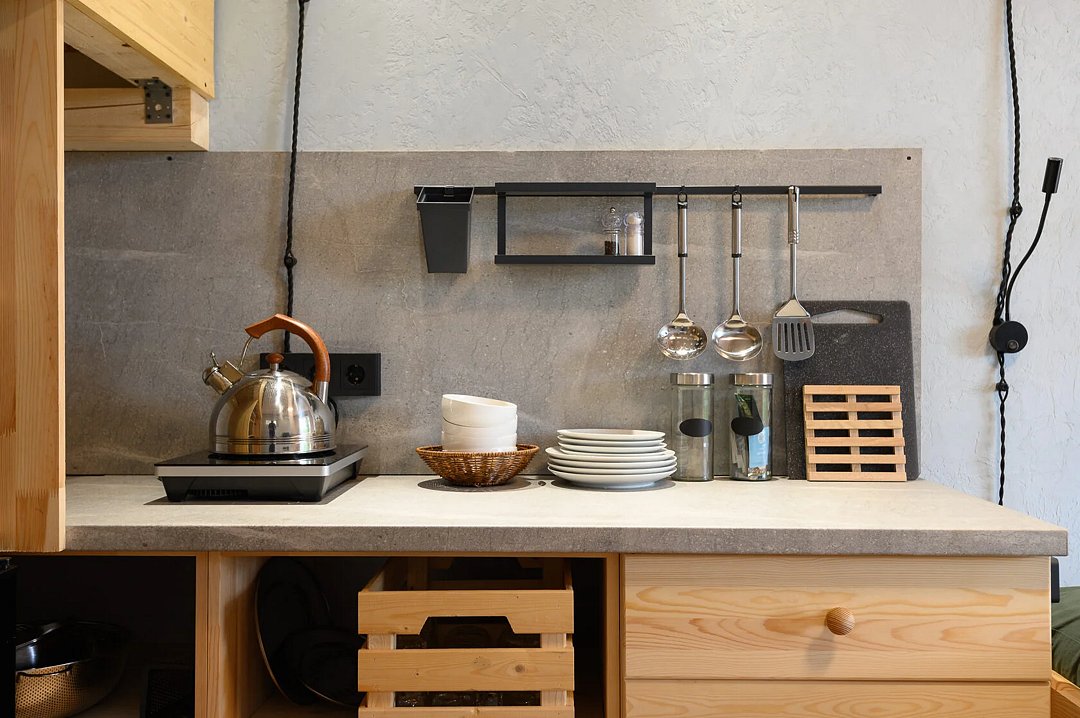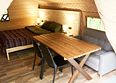 Номер оснащен тремя спальными местами. Оснащение номеров глэмпинга: электричество, обогреватели, электрический чайник, газовая комфорка, мини-холодильник, мини-кухня, набор посуды, полотенца, фен по требованию.