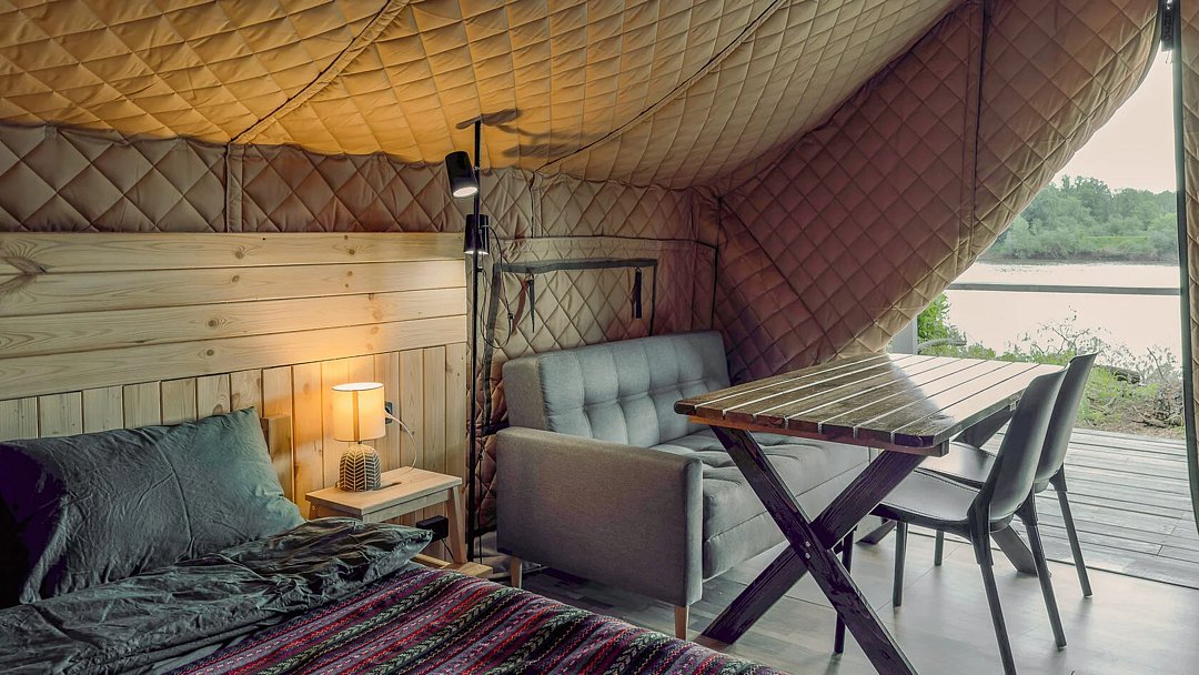 Комфортабельная утепленная палатка включает в себя спальную зону с двуспальной кроватью и диваном, гардеробной, мини-кухню и террасу с видом на водную гладь.