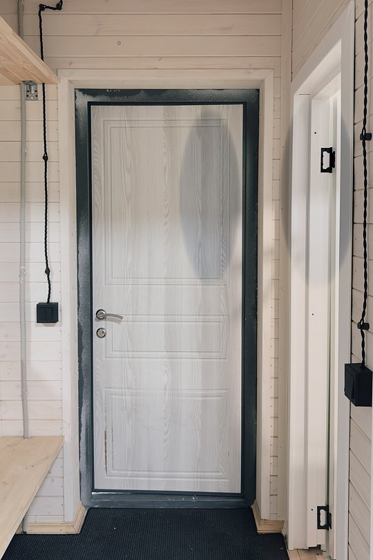 Гостевой дом включает в себя спальную зону с одной двуспальной кроватью и диваном-кроватью, гардеробной, мини-кухню и панорамными окнами с видом на водную гладь или лес.