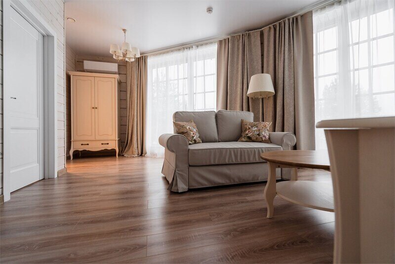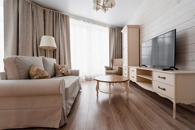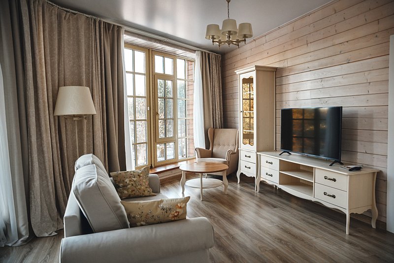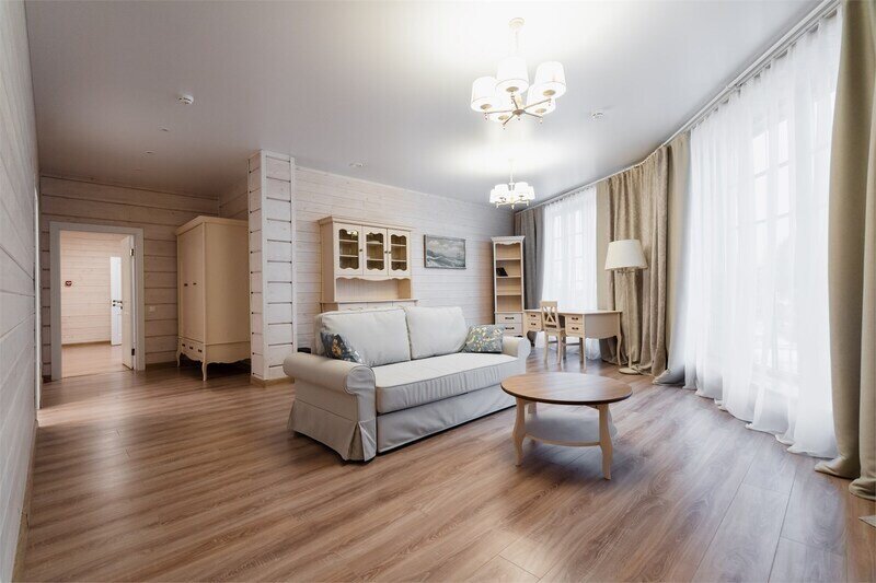 В номере 2 комнаты: гостиная и спальня. Просторная гостиная с панорамными окнами, раскладывающимся диваном, телевизором и рабочей зоной.