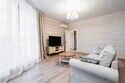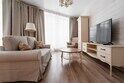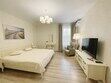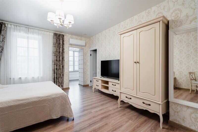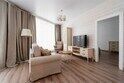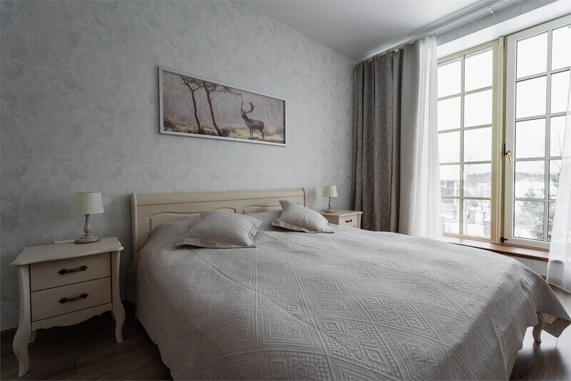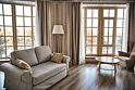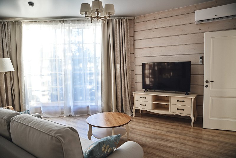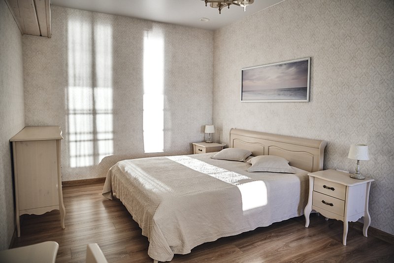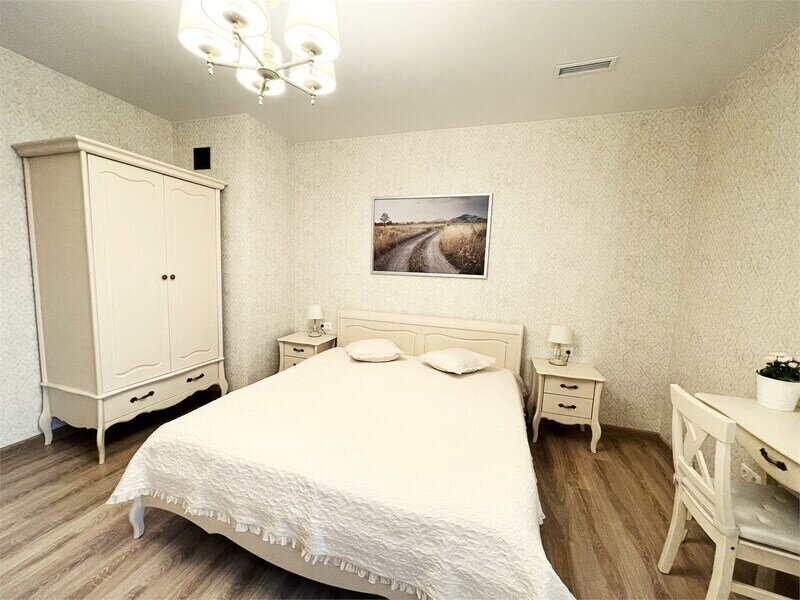 В номере 2 комнаты: гостиная и спальня. Просторная гостиная с панорамными окнами, раскладывающимся диваном , телевизором. Спальня с большой двухместный кроватью.