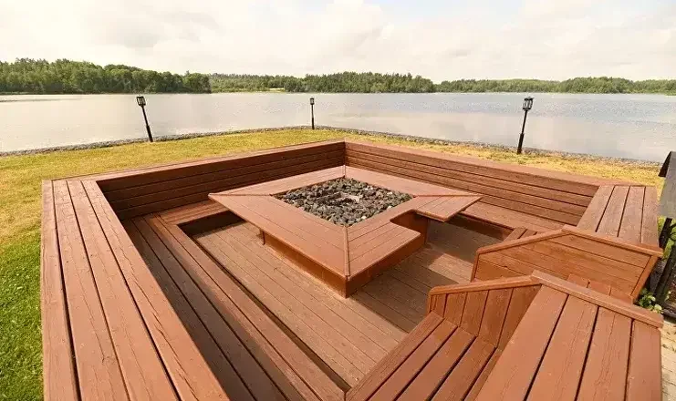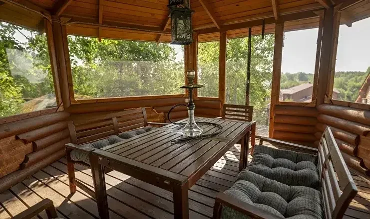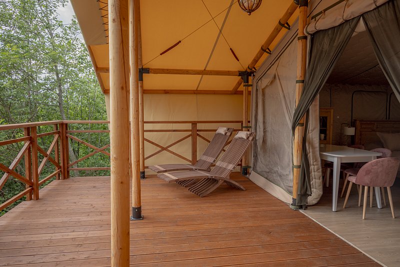 Тент обустроен собственной террасой для отдыха.