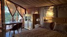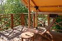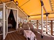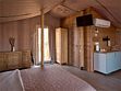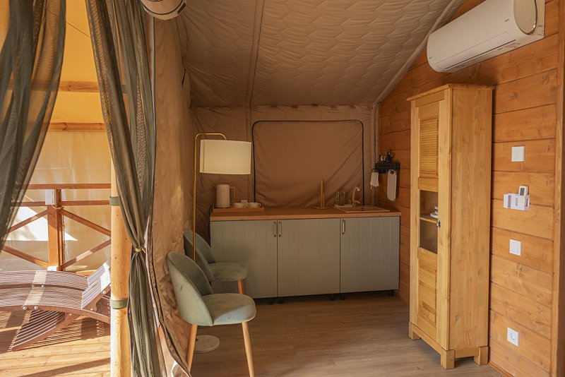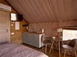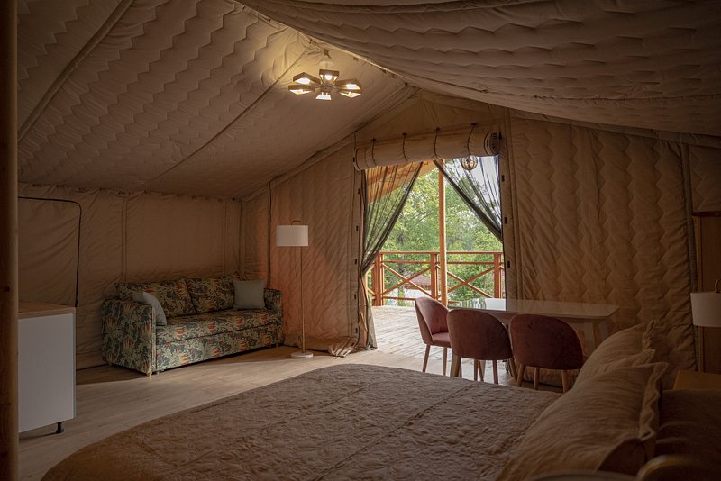 Оборудован спальной зоной с большой кроватью, есть кухонный уголок и комфортная ванная комната. Тент обустроен просторной террасой для отдыха.