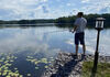Спальня с большой двухместный кроватью, шкафом, TV, и видом на озеро. В номере собственная ванная комната и кондиционер.