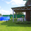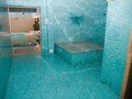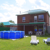 Уличная зона: Большой бассейн под стеклянной крышей с цветной подсветкой крыши и потолка, мангальная зона мангалом и мебелью для отдых, шезлонги для загара.