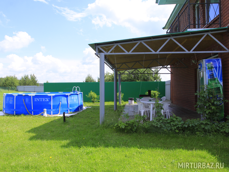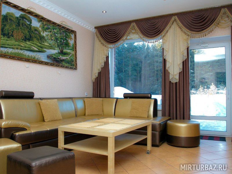 В доме: Сауна с двухместной джакузи, хамам, спальня, санузел, душ, мягкая мебель, корпусная мебель, двуспальная кровать, обеденный стол со стульями, холодильник, телевизор (Триколор ТВ), микроволновая печь.