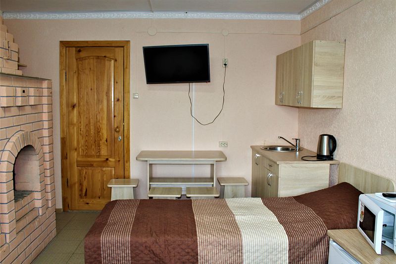 Одна двуспальная кровать, стол, табуреты. В номере имеется туалетная комната (душевая кабинка, раковина, унитаз). ТВ, микроволновая печь, холодильник, чайник. Постельное белье и полотенца.