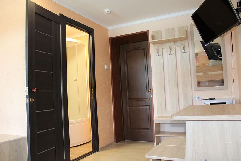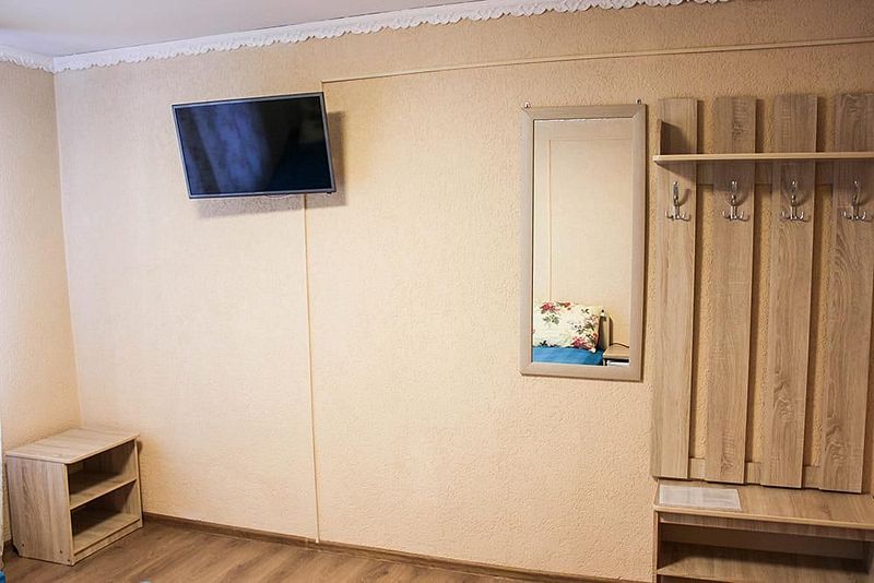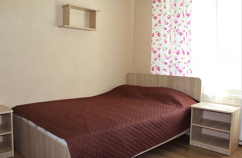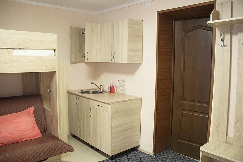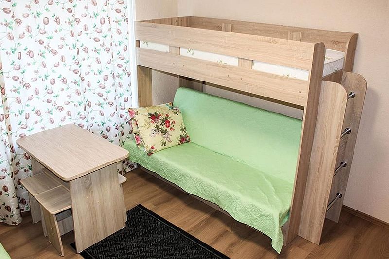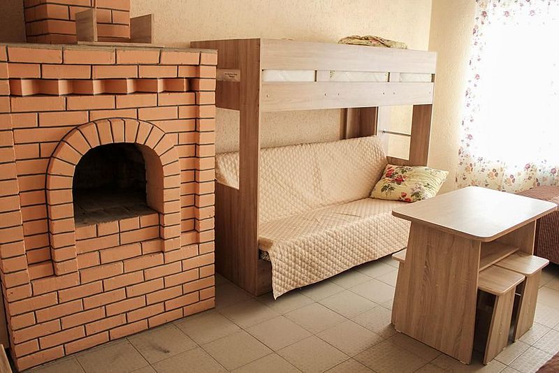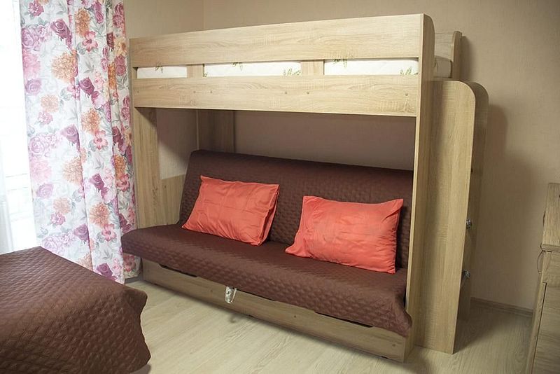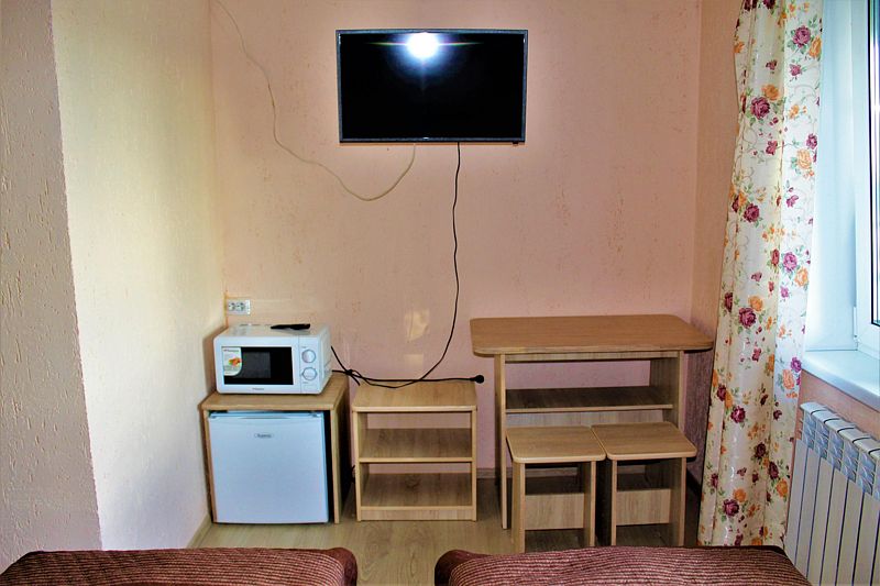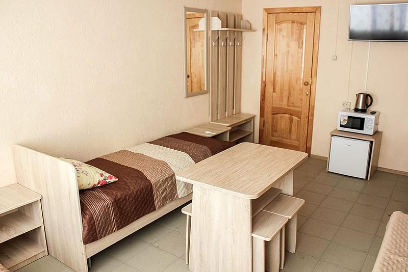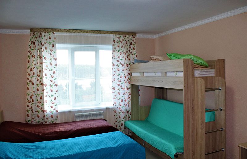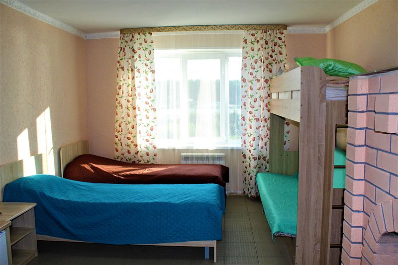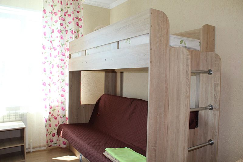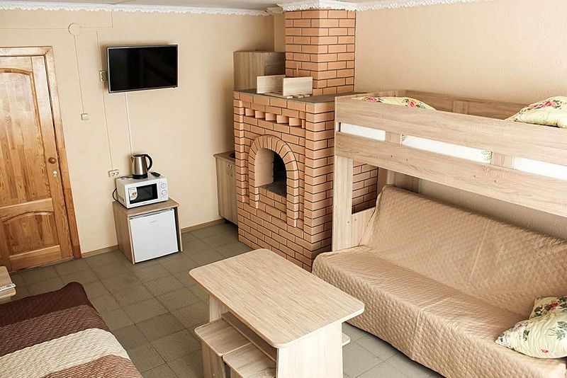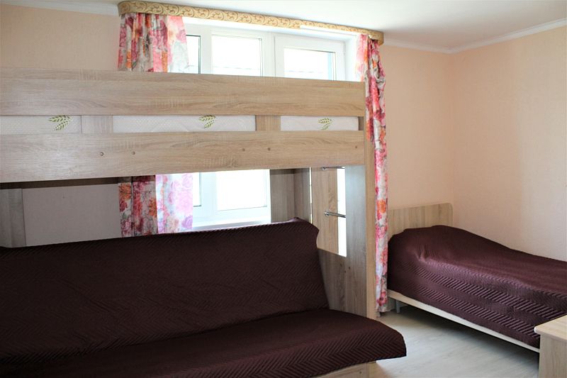 Одна односпальная кровать, одна двухъярусная кровать (первый ярус – диван двухместный, второй ярус кровать), прикроватные тумбочки, стол, табуреты. В номере имеется горячая и холодная вода, основная посуда, (тарелки, ложки, вилки, стаканы) постельное белье, полотенца, ТВ, чайник, микроволновая печь, холодильник.