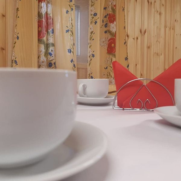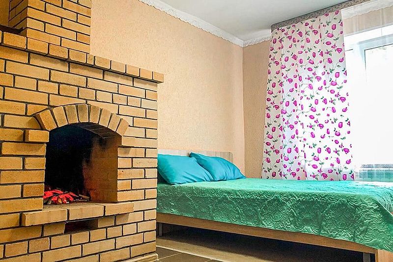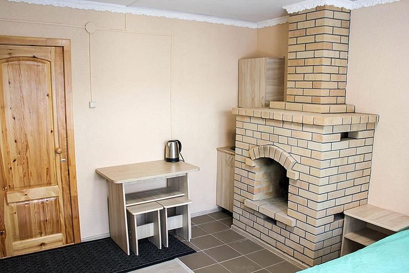 Одна двуспальная кровать, стол, табуреты, кухонный уголок. В номере имеется горячая и холодная вода, основная посуда, (тарелки, ложки, вилки, стаканы) постельное белье, полотенца, ТВ, чайник, микроволновая печь, холодильник), камин.
