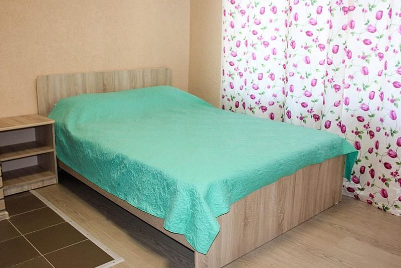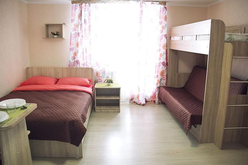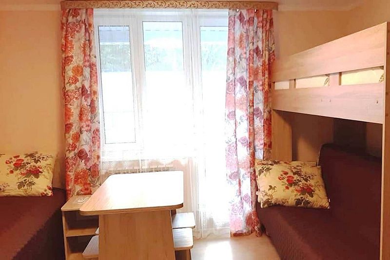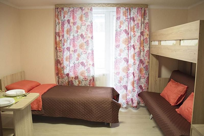 Одна односпальная кровать, одна двухярусная кровать (первый ярус – диван двухместный, второй ярус – кровать), прикроватные тумбочки, стол, табуреты. В номере имеется горячая и холодная вода, основная посуда, (тарелки, ложки, вилки, стаканы), постельное белье, полотенца, ТВ, чайник, микроволновая печь, холодильник.