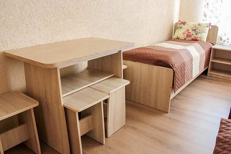 Три 1-спальные и одна 2-ярусная кровати (кровать и диван), тумбы, кух.уголок, ТВ, Ч, СВЧ, Х, с/у на этаже.