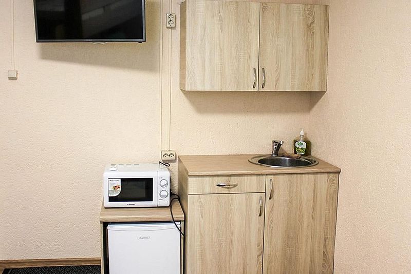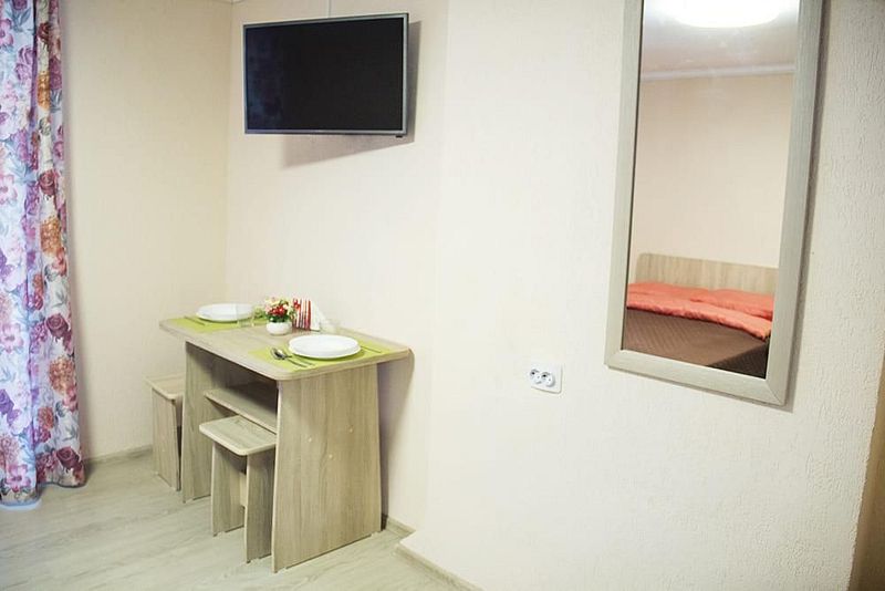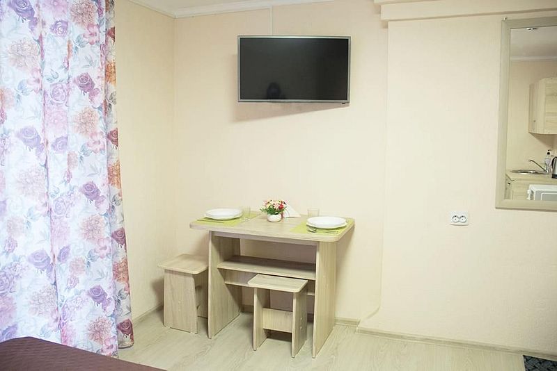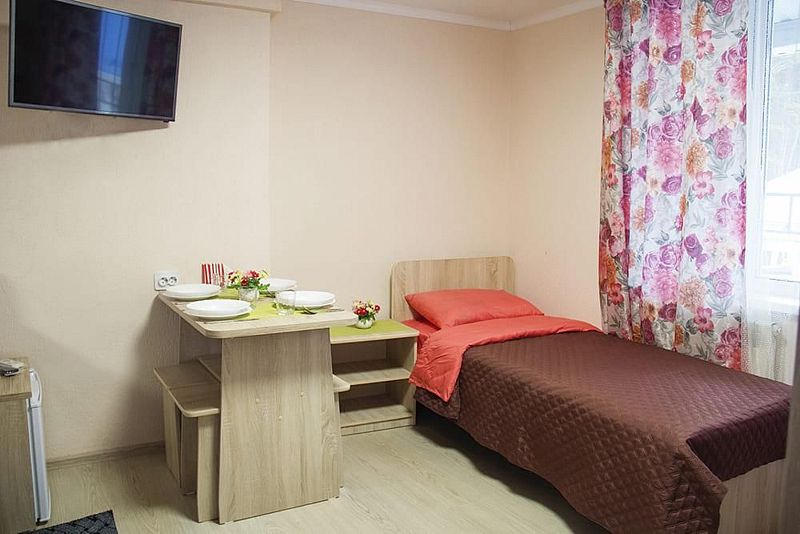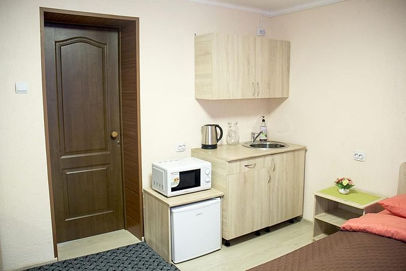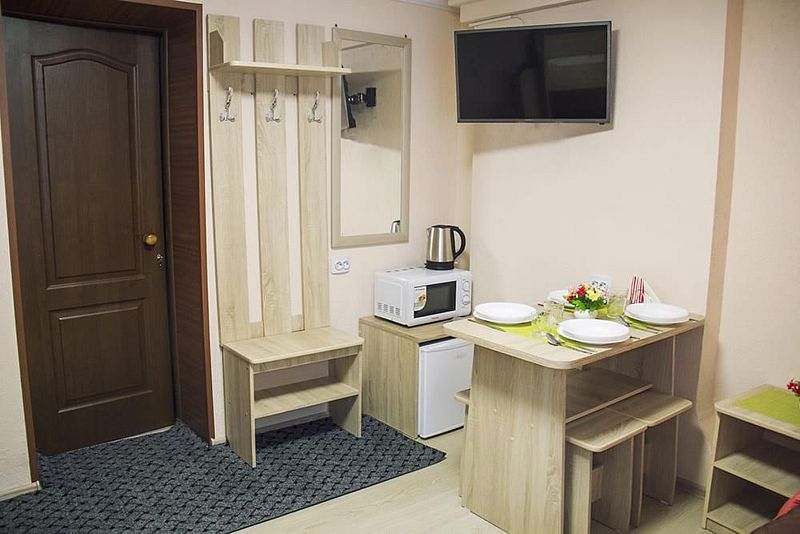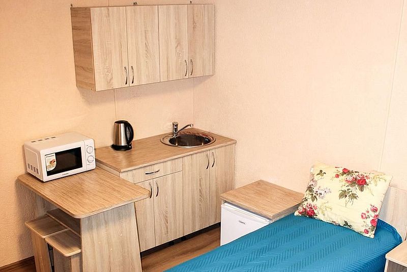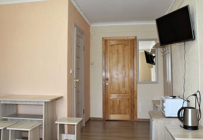 Две односпальные кровати, стол, табуреты, кухонный уголок. В номере имеется горячая и холодная вода, основная посуда (тарелки, ложки, вилки, стаканы), постельное белье, полотенца, ТВ, чайник, микроволновая печь, холодильник.