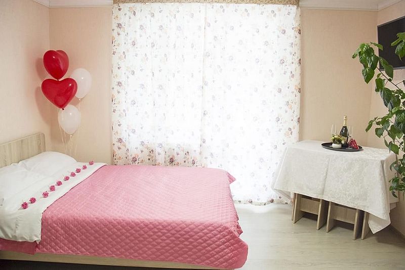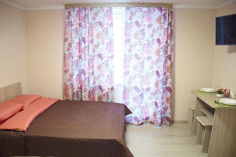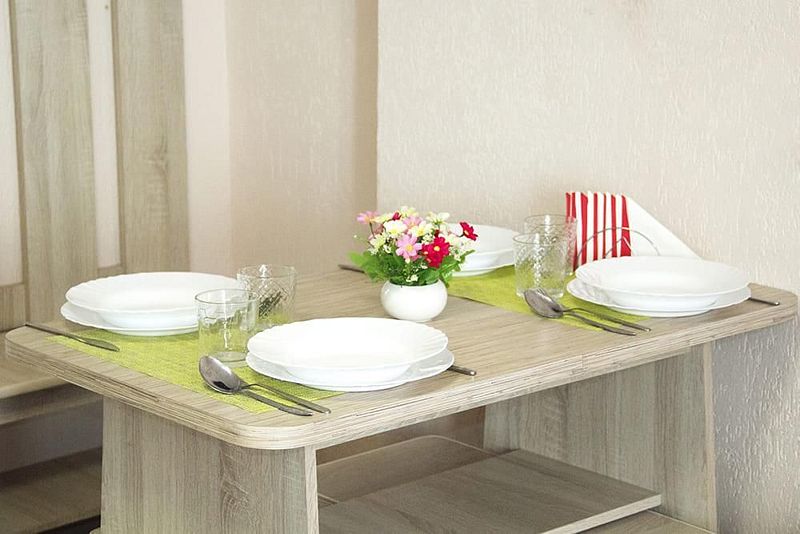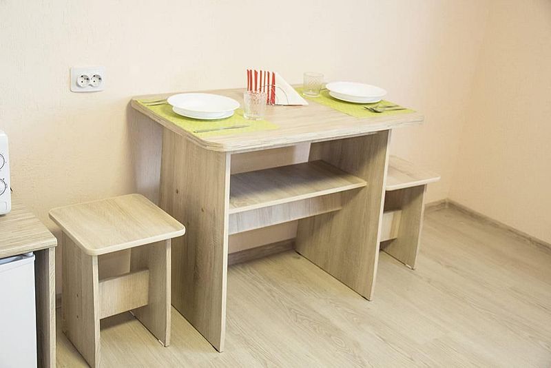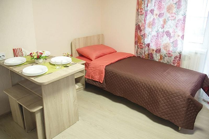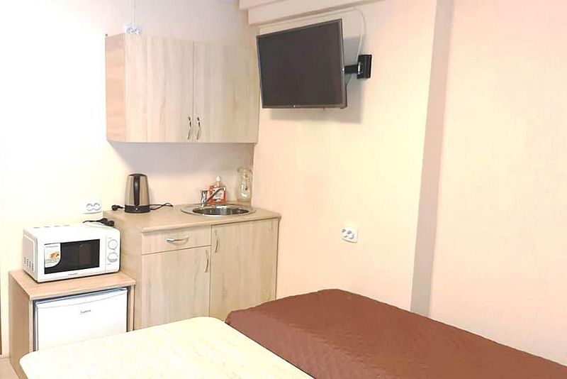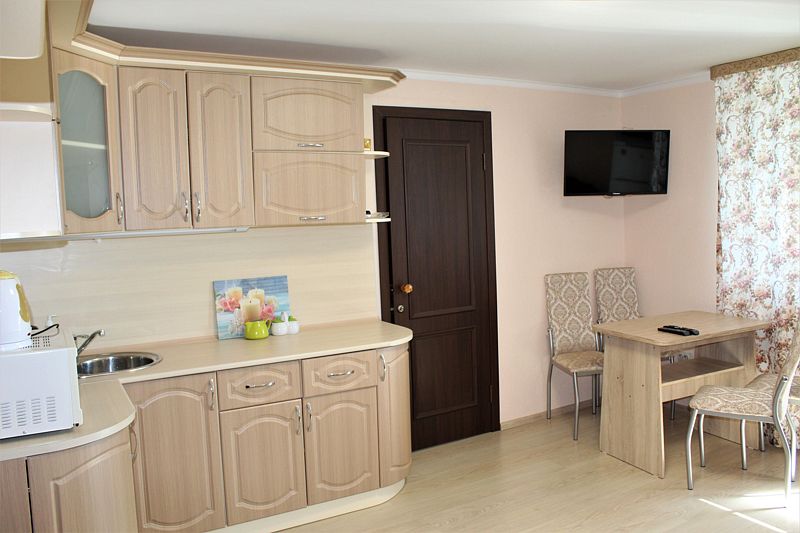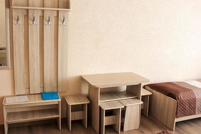 Две односпальные кровати, стол, табуреты, кухонный уголок. В номере имеется горячая и холодная вода, основная посуда (тарелки, ложки, вилки, стаканы), постельное белье, полотенца, ТВ, чайник, микроволновая печь, холодильник.
