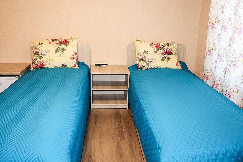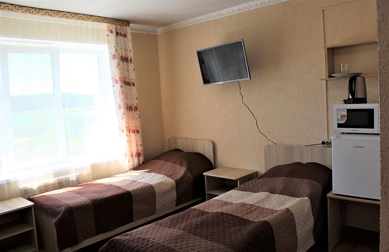 Две односпальные кровати, стол, табуреты, прикроватные тумбочки. В номере имеется туалетная комната (душевая кабинка, раковина, унитаз). ТВ, микроволновая печь, холодильник, чайник. Постельное белье и полотенца.