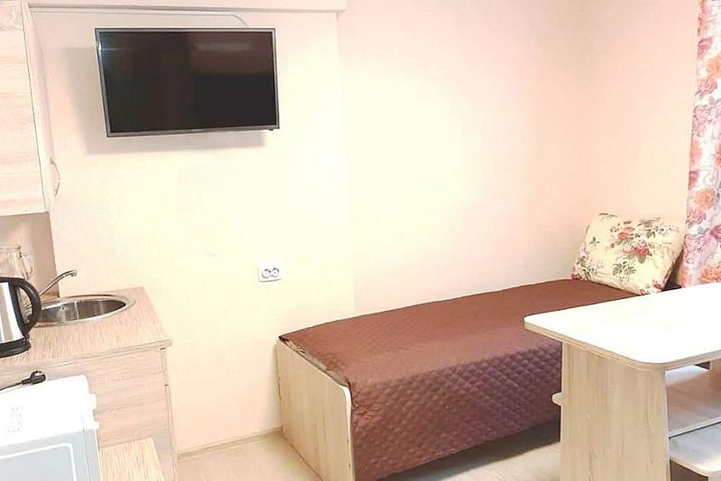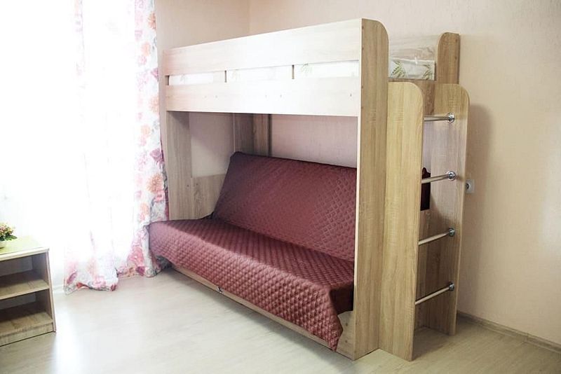 1-спальная и 2-ярусная кровати (кровать и диван), стол, СВЧ, ТВ, Х, Ч, с/у на этаже.