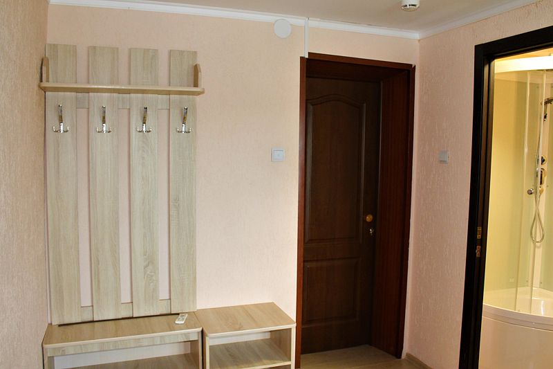 Одна двуспальная кровать, одна двухъярусная кровать (первый ярус – диван двухместный, второй ярус – кровать), прикроватные тумбочки, стол, табуреты. В номере имеется туалетная комната (душевая кабинка, раковина, унитаз). ТВ, микроволновая печь, холодильник, чайник. Постельное белье и полотенца.
