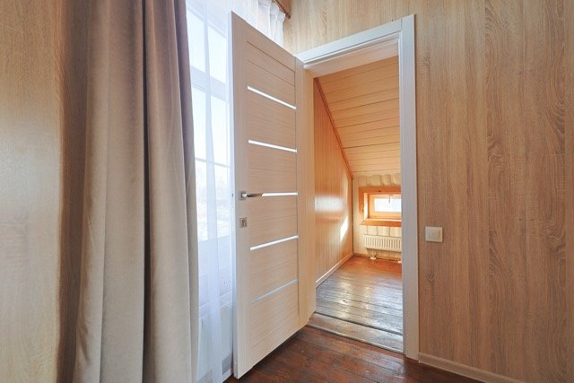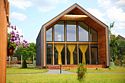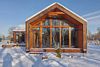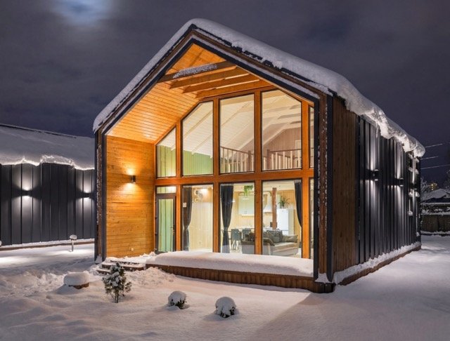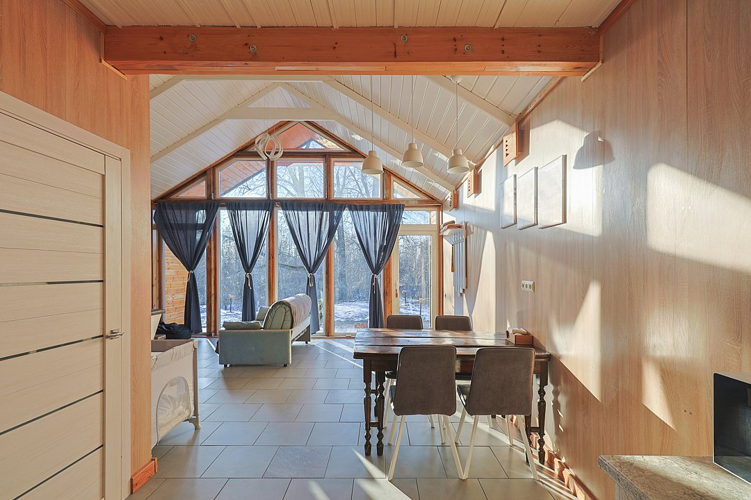 Современный двухэтажный дом из натурального дерева, с большими окнами и обилием естественного света: