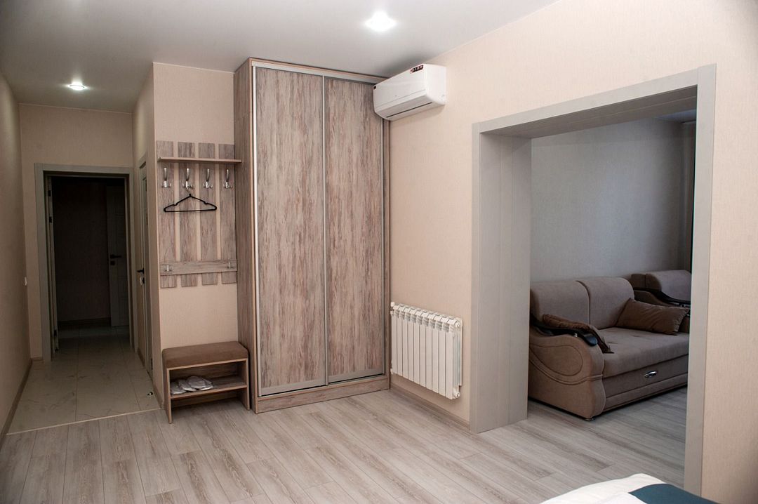 Комфортный однокомнатный номер с большой двуспальной кроватью с ортопедическим матрасом и одноместным раскладным диваном.