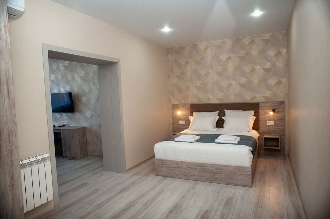 Просторный двухкомнатный номер с большой двуспальной кроватью с ортопедическим матрасом, двухместным раскладным диваном и креслом-кроватью.