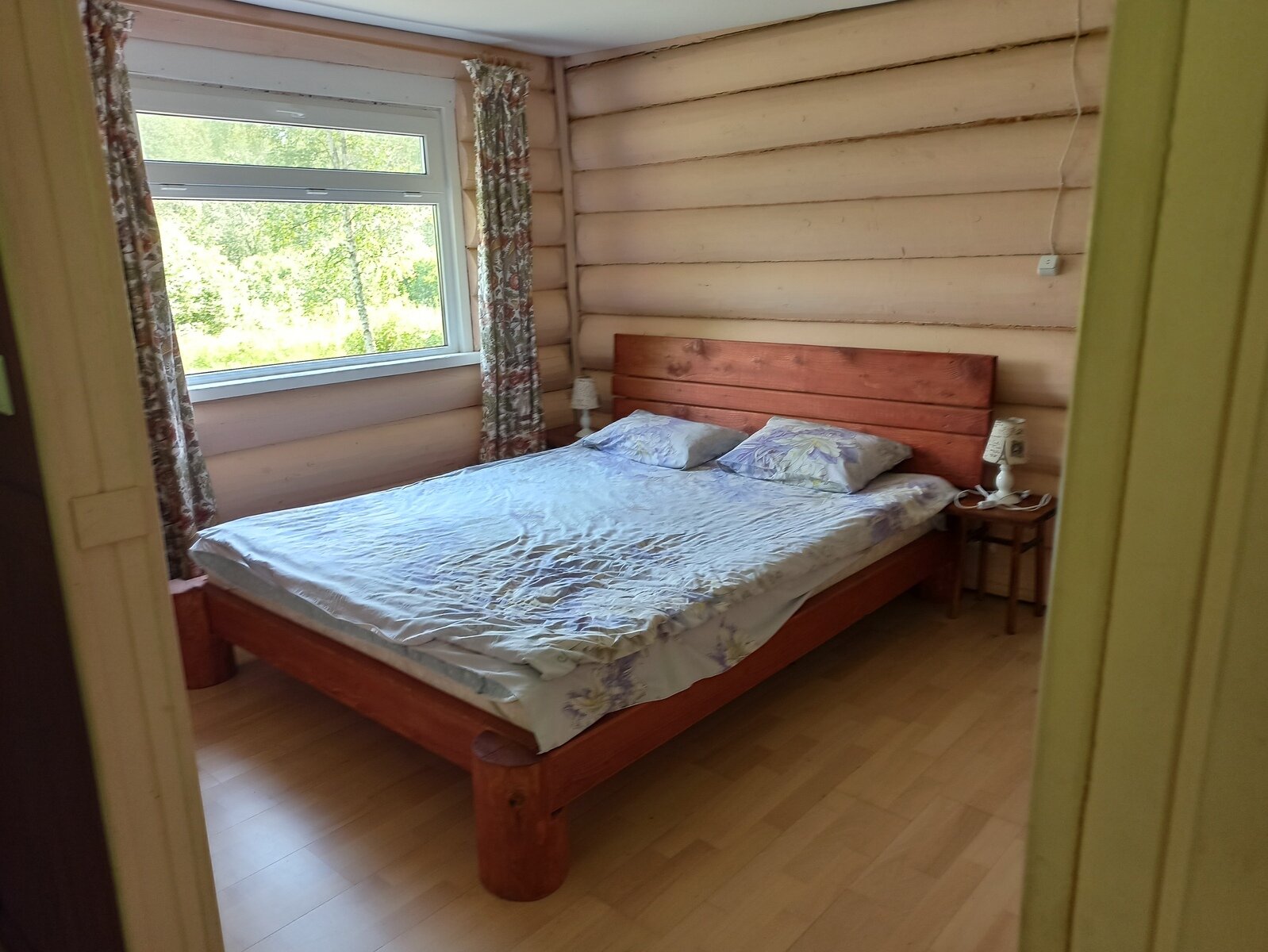 В доме есть 2 спальни и гостиная с кухней. Кухня в коттедже оснащена холодильником, электрической плитой и всей необходимой посудой. Горячая и холодная вода на кухне и в ванной.