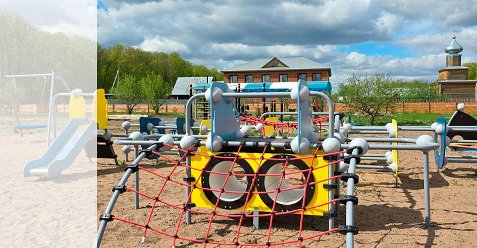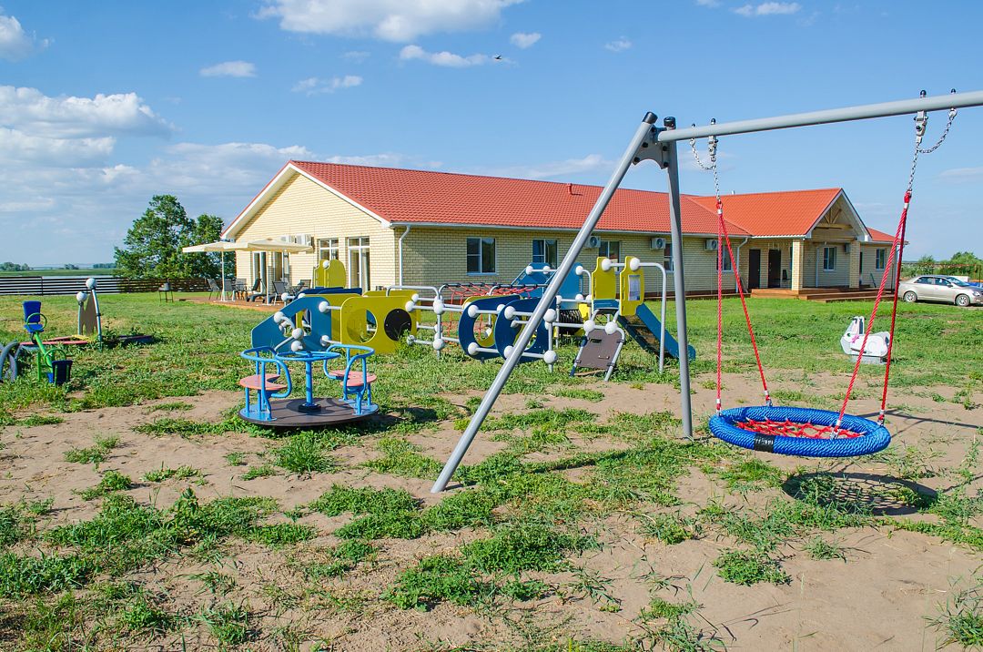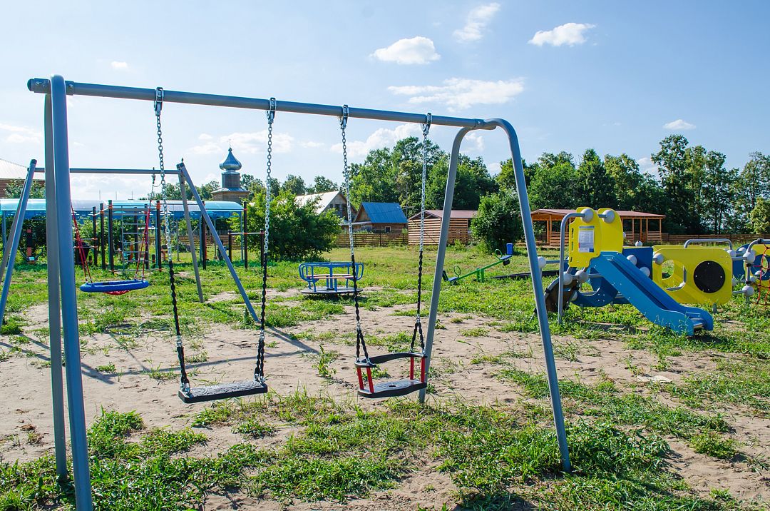 Детская площадка представляет собой лабиринт с двумя горками и множеством увлекательных препятствий. Здесь также расположены разнообразные качели и карусель, которые обещают юным гостям не только радость, но и активный отдых на свежем воздухе.