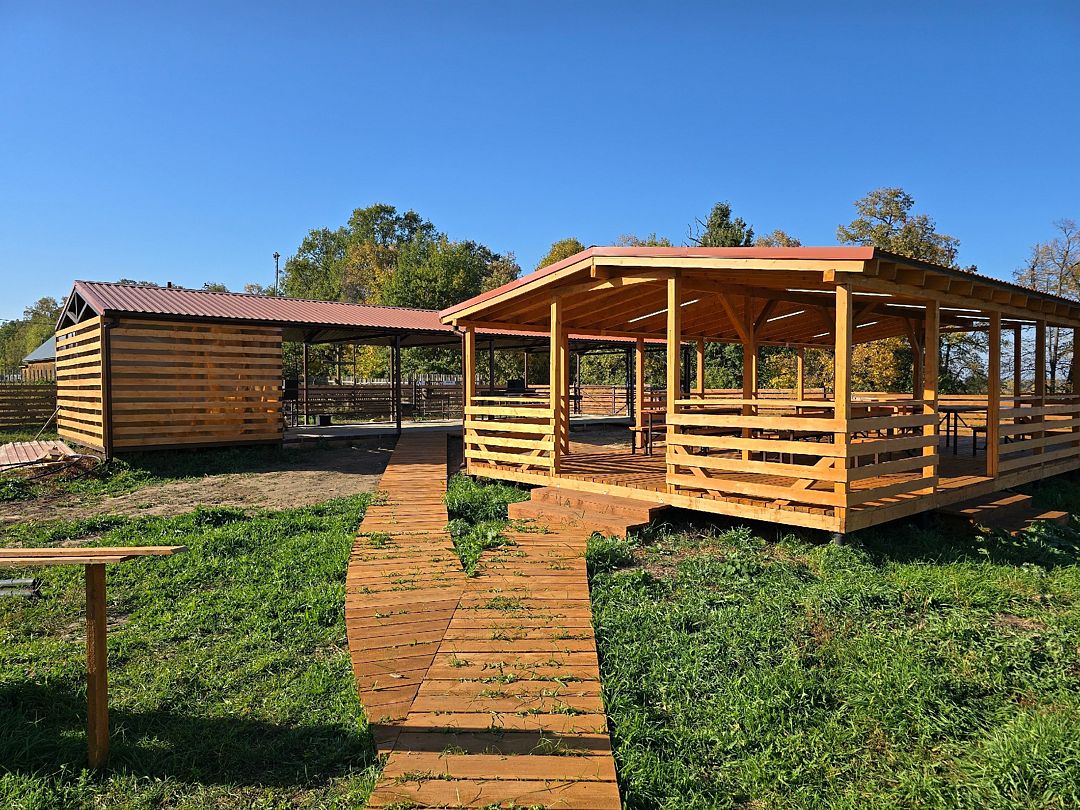 На территории базы возвышается просторная беседка размером 12х6 метров, где уют и комфорт гармонично сочетаются с практичностью. Внутри установлены удобные столы и скамейки, создающие идеальные условия для отдыха.