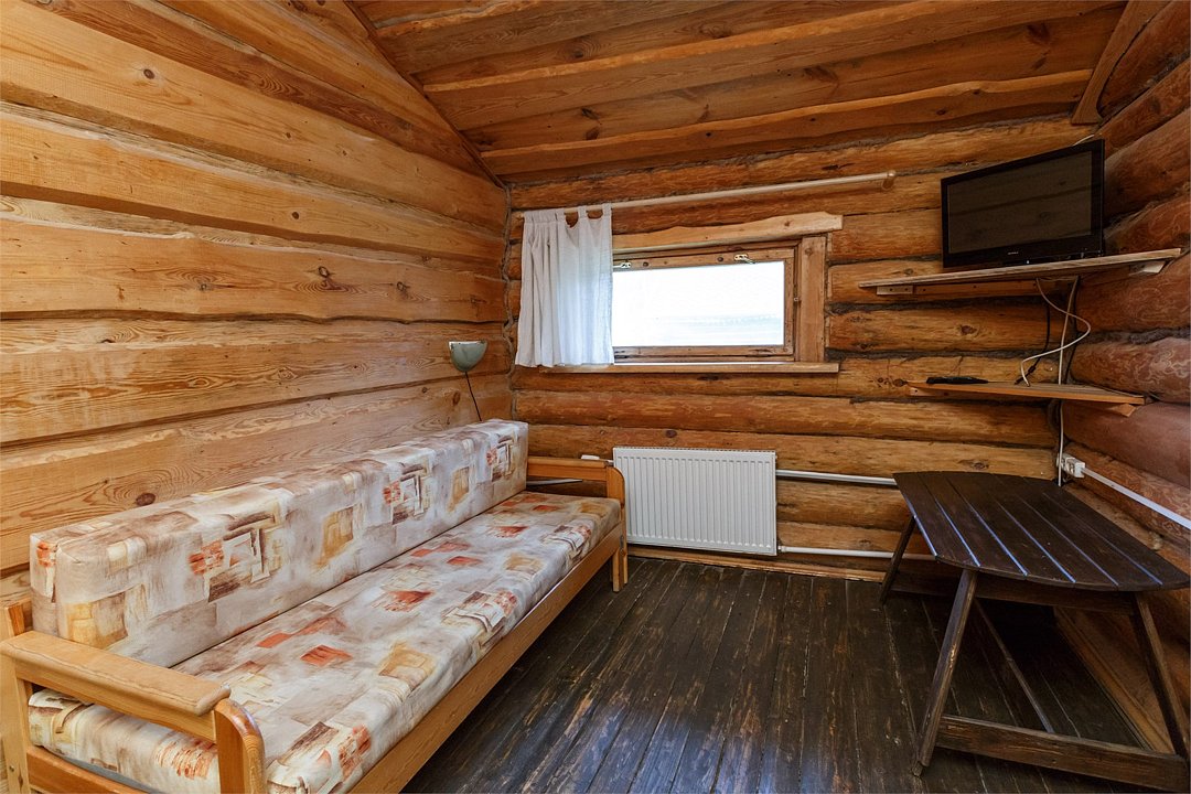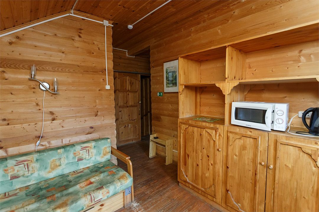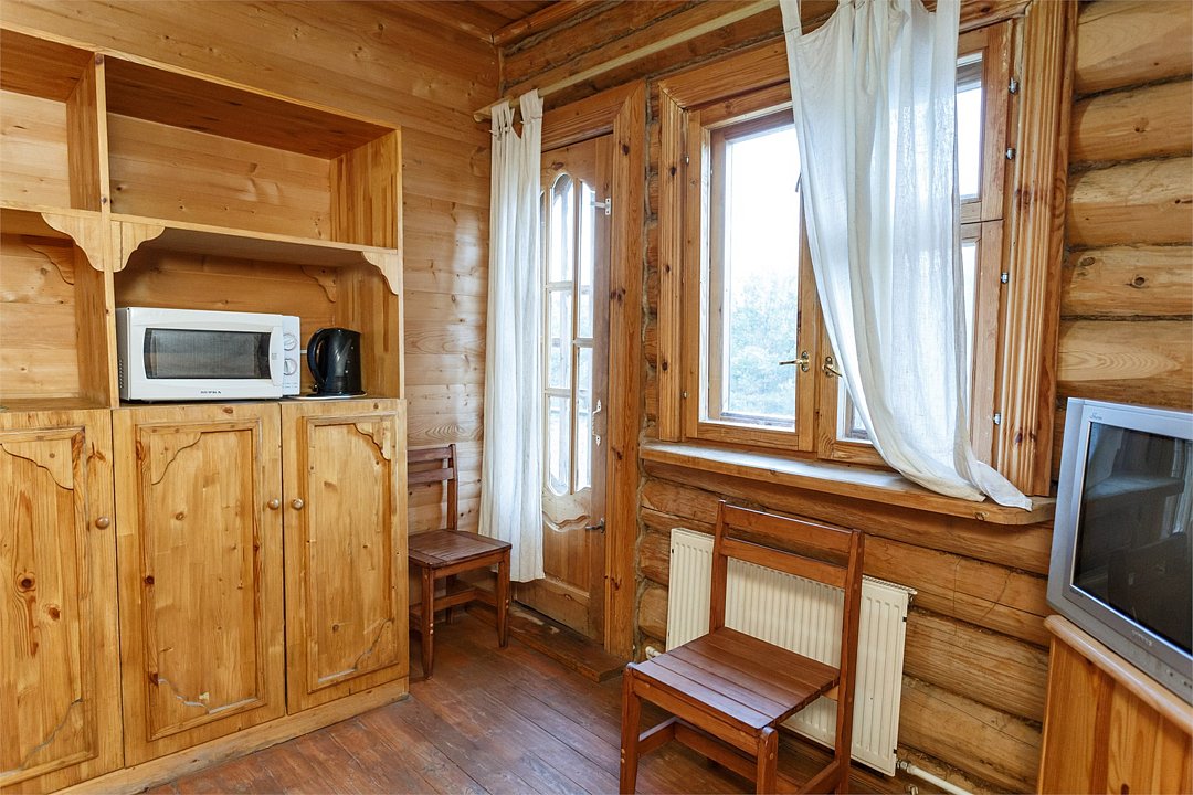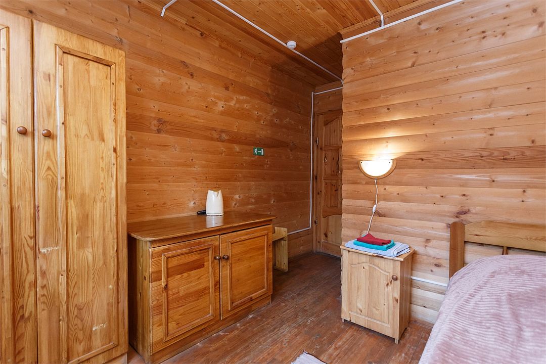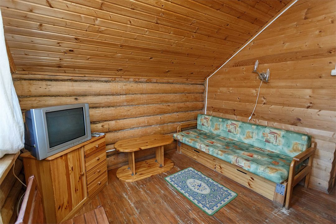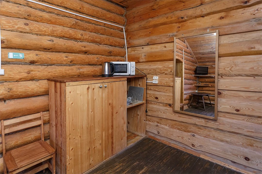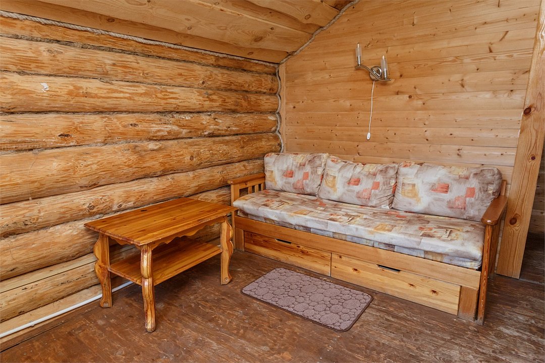 Двухместный номер «стандарт» малый площадью 25 кв.м. — две просторных комнаты, где семья или небольшая группа туристов может отдохнуть за небольшую сумму. Помещение чистое, светлое с бревенчатыми стенами, деревянным потолком и полом. Интерьер в эко-стиле задает положительный настрой.
