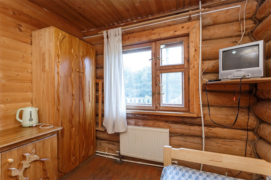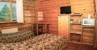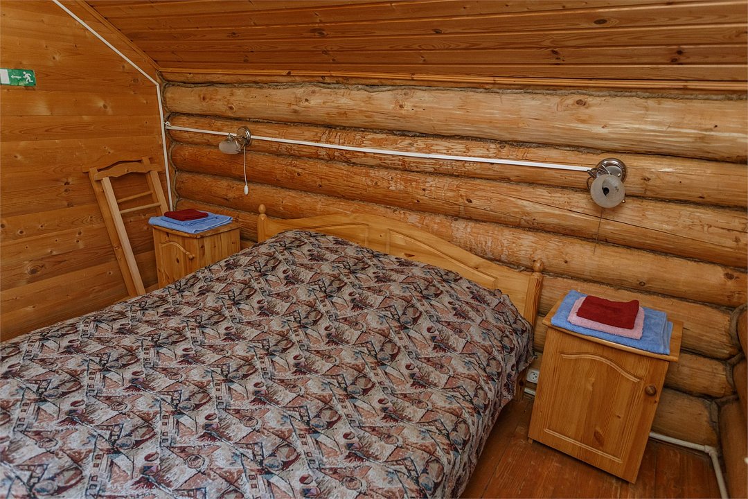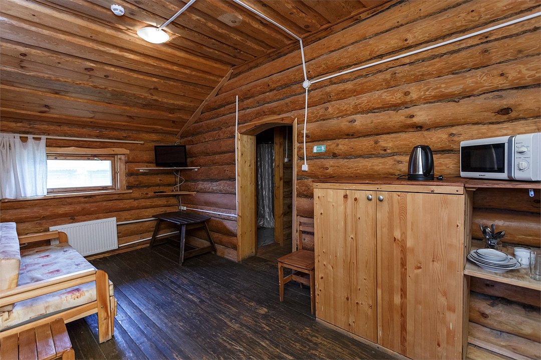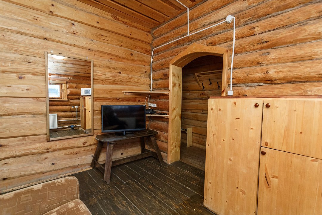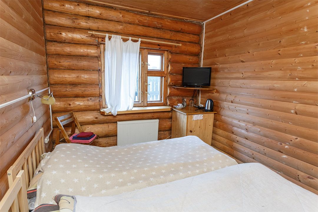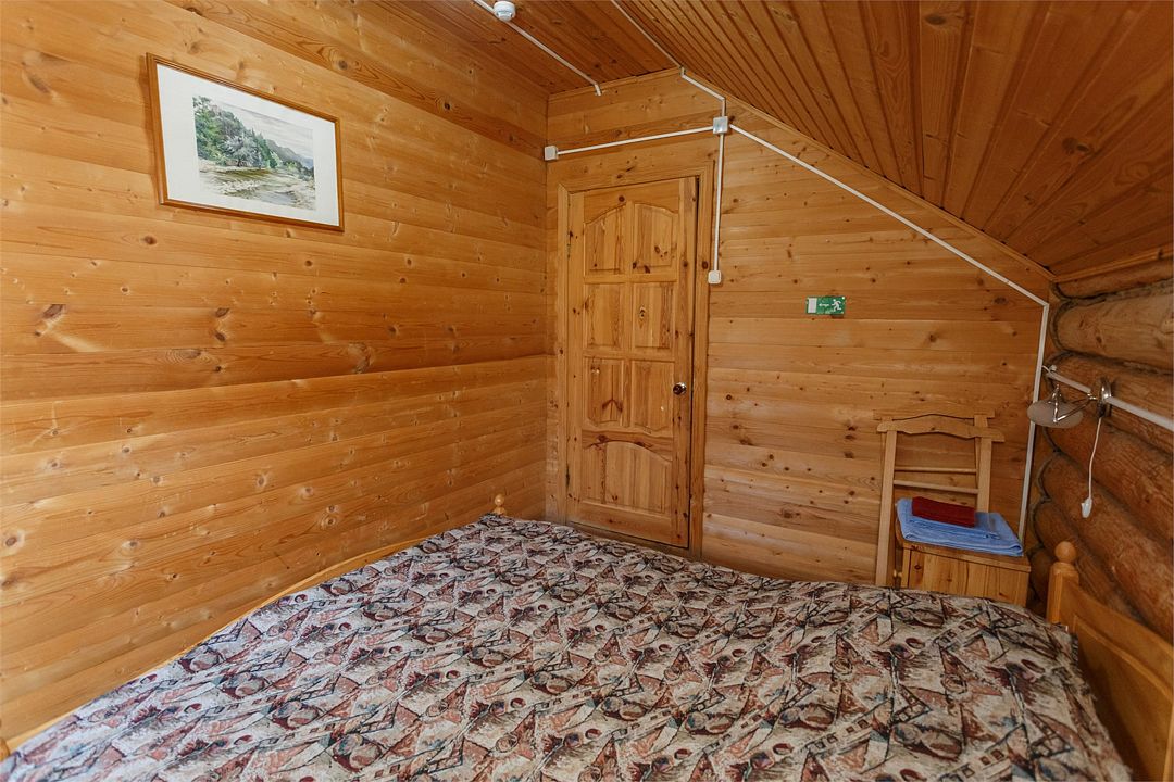 Двухместный номер «стандарт» малый площадью 25 кв.м. — две просторных комнаты, где семья или небольшая группа туристов может отдохнуть за небольшую сумму. Помещение чистое, светлое с бревенчатыми стенами, деревянным потолком и полом. Интерьер в эко-стиле задает положительный настрой.
