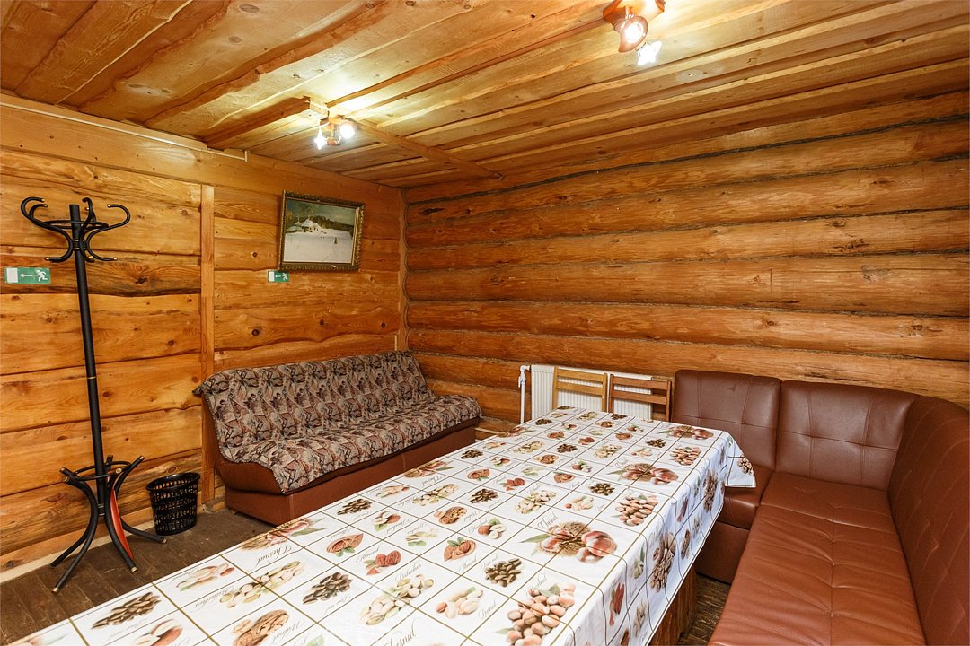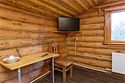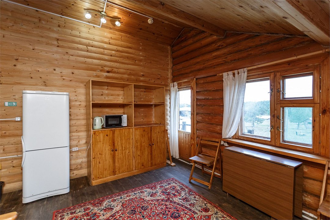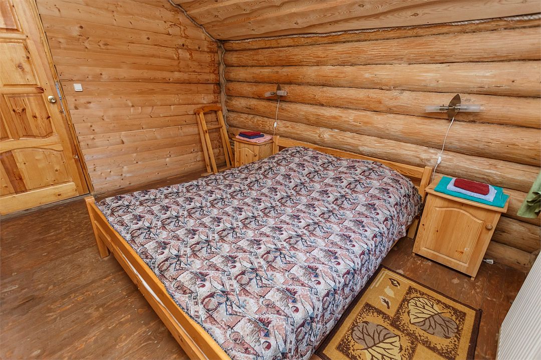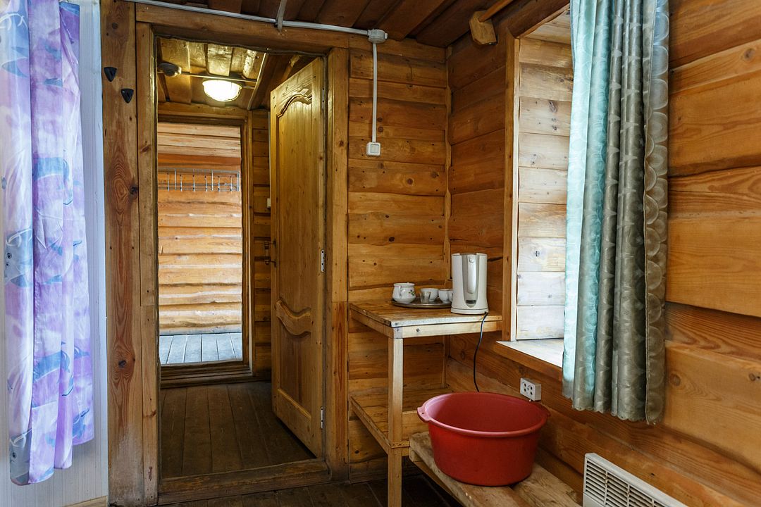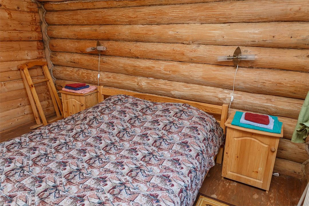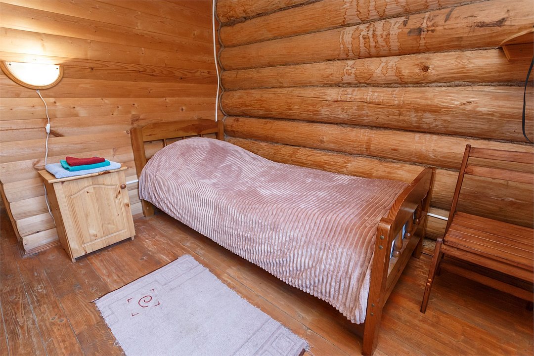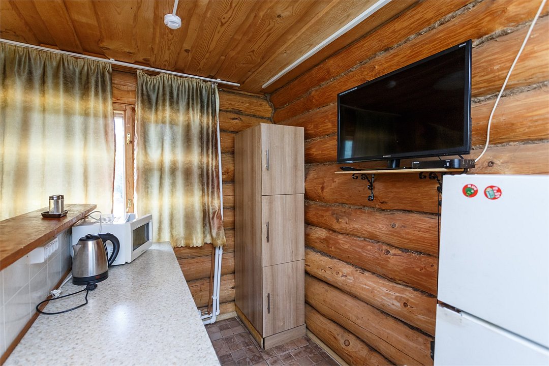 Двухместный номер «стандарт» малый площадью 25 кв.м. — две просторных комнаты, где семья или небольшая группа туристов может отдохнуть за небольшую сумму. Помещение чистое, светлое с бревенчатыми стенами, деревянным потолком и полом. Интерьер в эко-стиле задает положительный настрой.