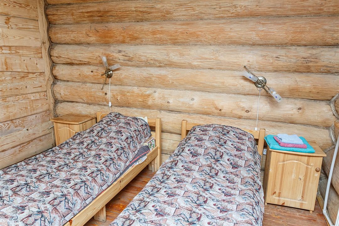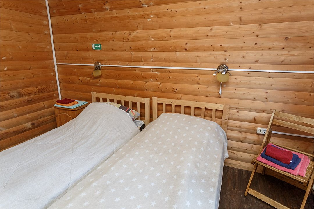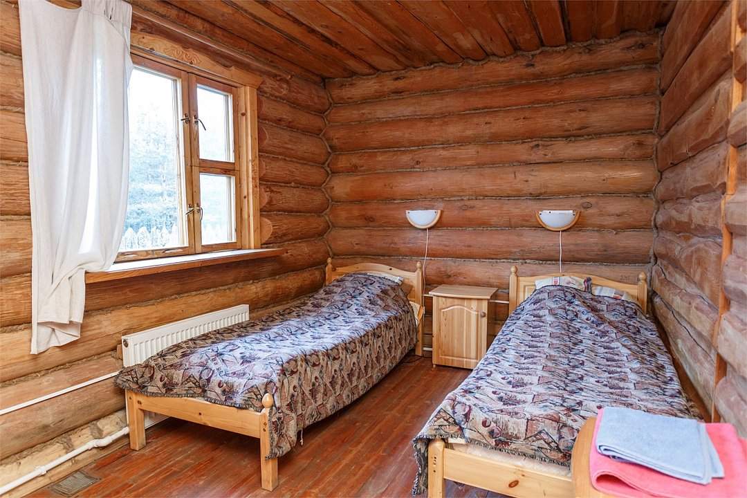 Двухместный номер «стандарт» малый площадью 18 кв.м. — просторная комната, где семья или небольшая группа туристов может отдохнуть за небольшую сумму. Помещение чистое, светлое с бревенчатыми стенами, деревянным потолком и полом. Интерьер в эко-стиле задает положительный настрой.