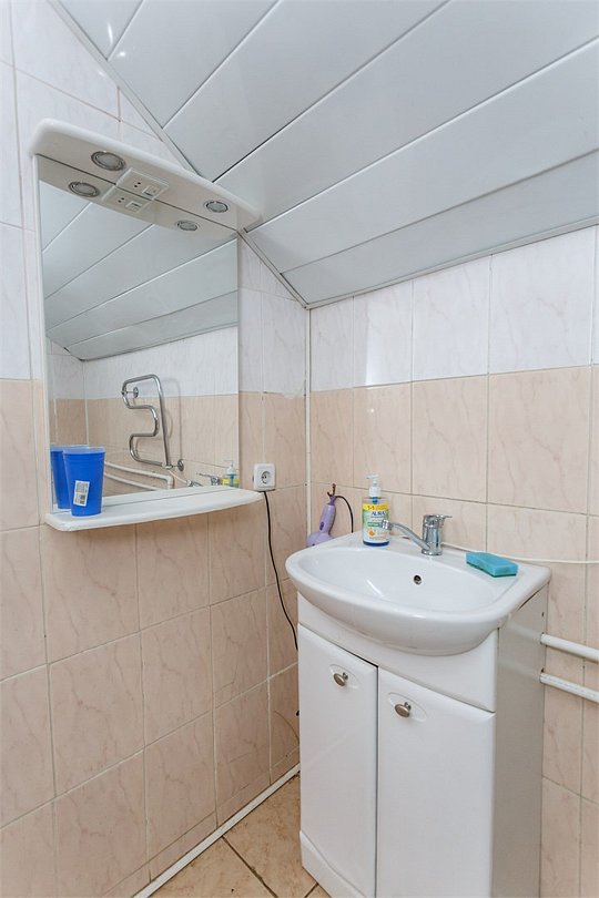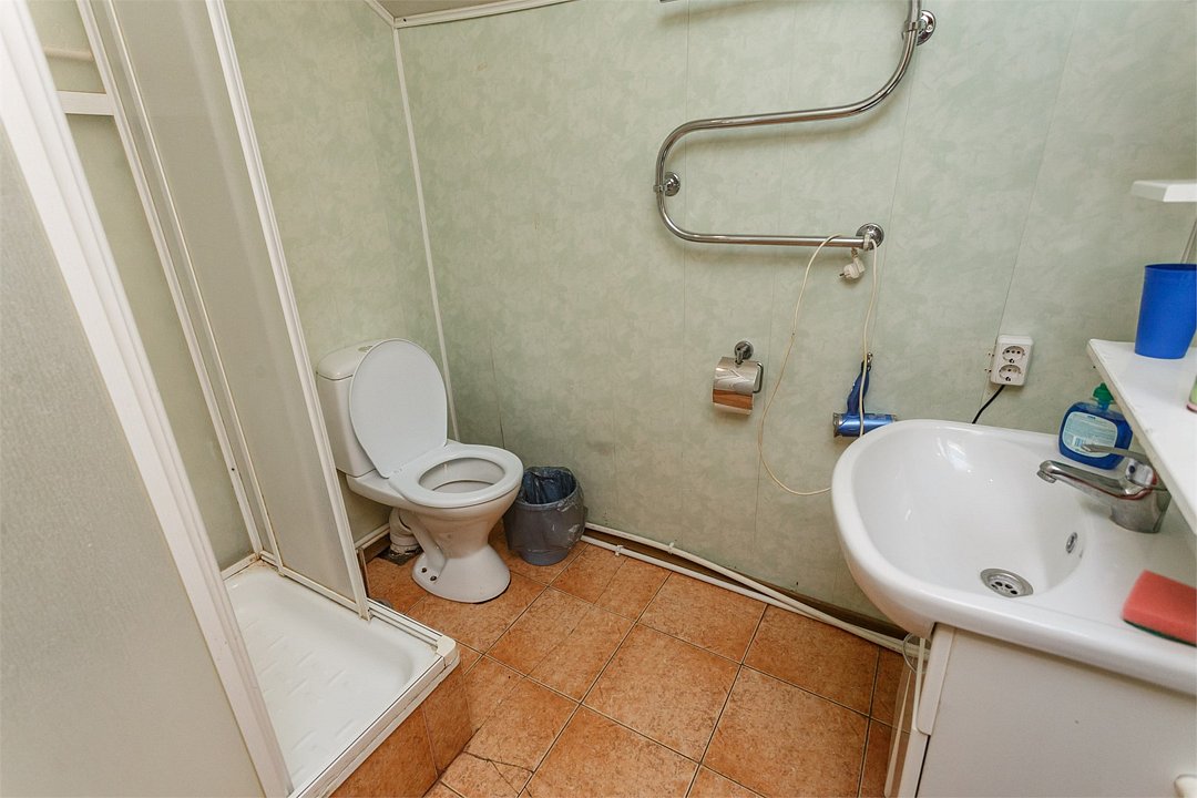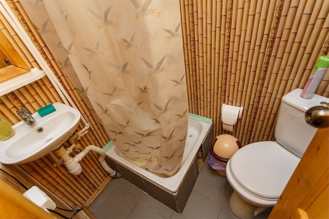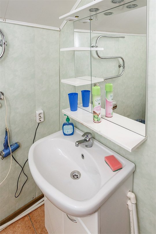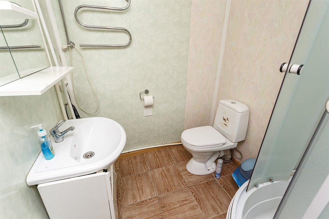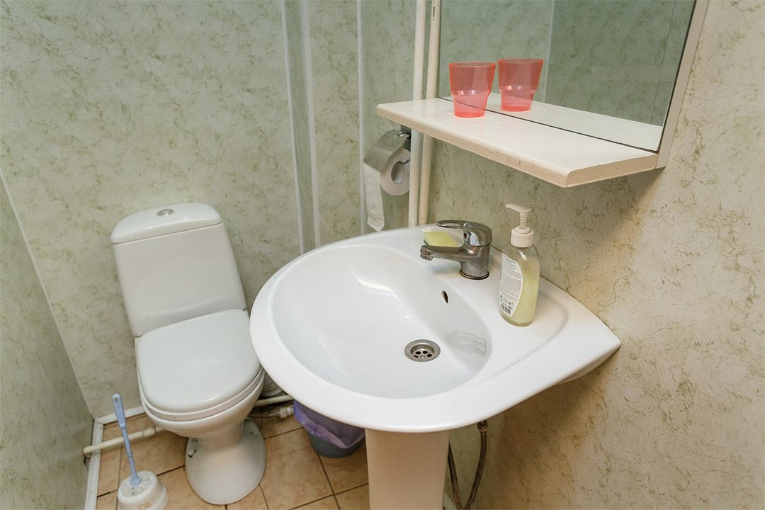 В помещении имеется необходимая мебель: две односпальные кровати, стул и тумба под телевизор. Постельное белье предоставляется и включено в оплату. Из техники установлен телевизор, холодильник и чайник. Санузел без душа, но оборудован зеркалом, удобной раковиной со шкафчиками.