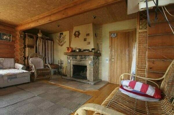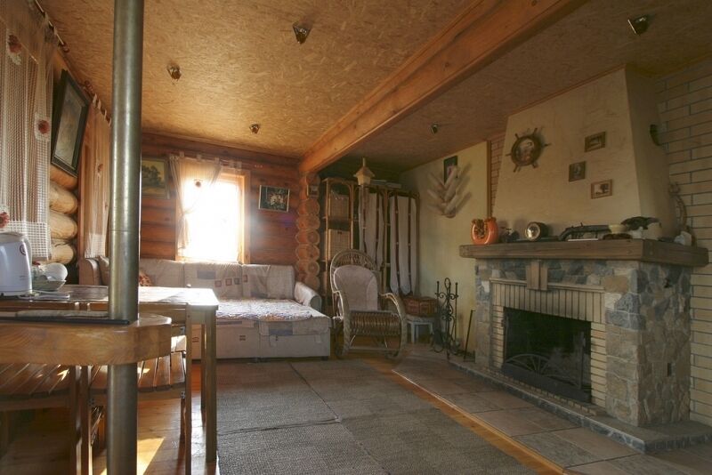 Камин, косметические принадлежности, простая и уютная обстановка.