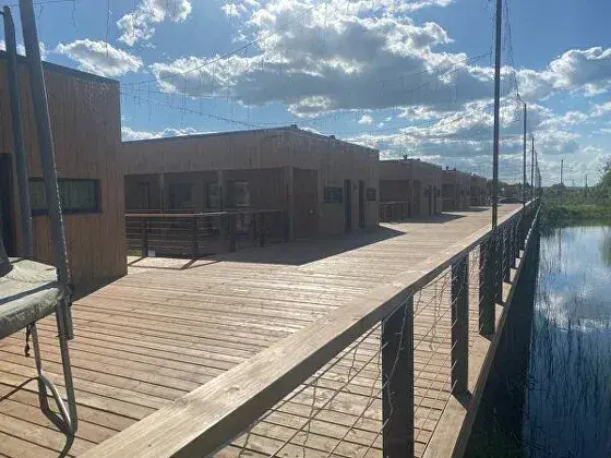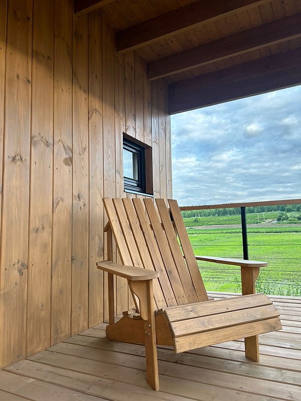 Возле каждого домика терраса с выходом на воду, столики, зонтики, кресла в летний период, а также выход на поля с ягодными грядками.