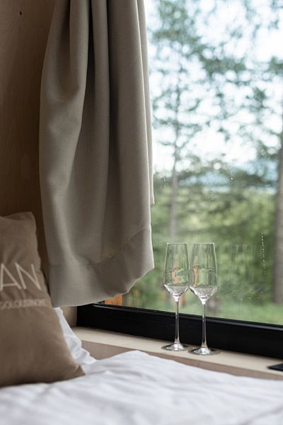 Есть необходимые туалетные принадлежности, полотенца, фен. Панорамные окна в каждом домике дарят возможность любоваться прекрасным видом на реку и горы, не выходя наружу.