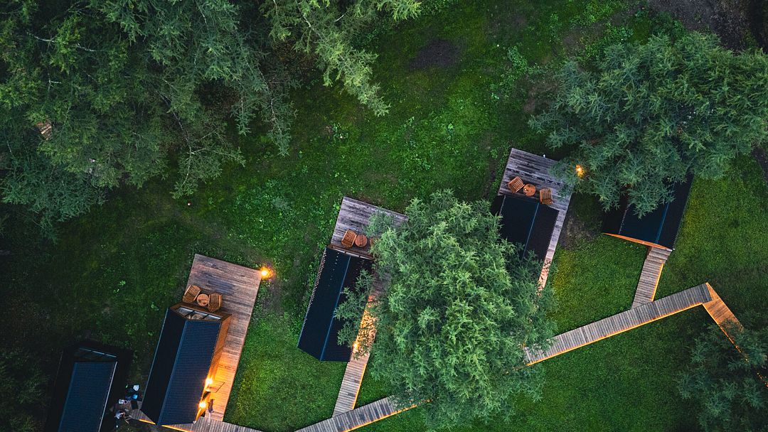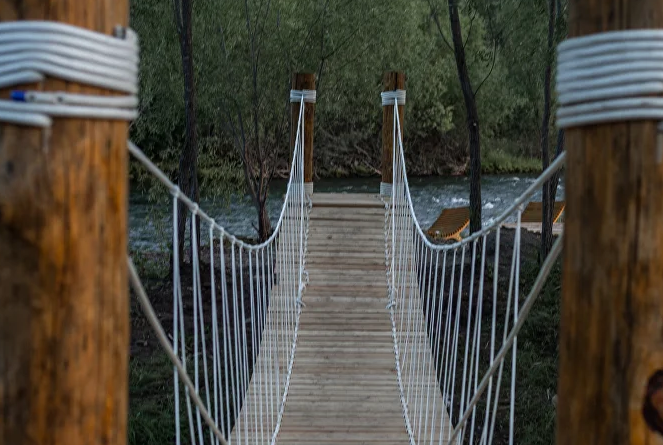 Русская баня подарит гостям возможность расслабиться и отдохнуть после насыщенного дня. Баня имеет свою открытую террасу и территорию, полностью оборудованную для идеального отдыха. Канатный мост на соседний островок и собственное озеро, в котором можно окунуться.