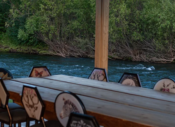 Летний вариант ресторана — пергола с открытой террасой на берегу реки. Пергола работает по времени на завтраки и ужины.