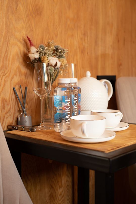 Номер оборудован местом для хранения вещей, чайными наборами, бокалами для игристого.