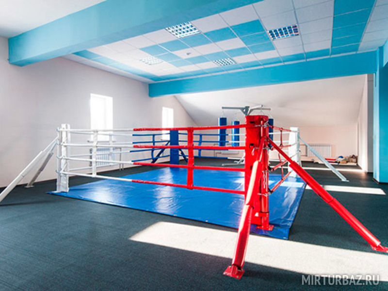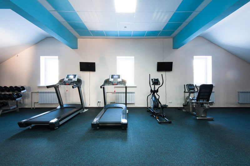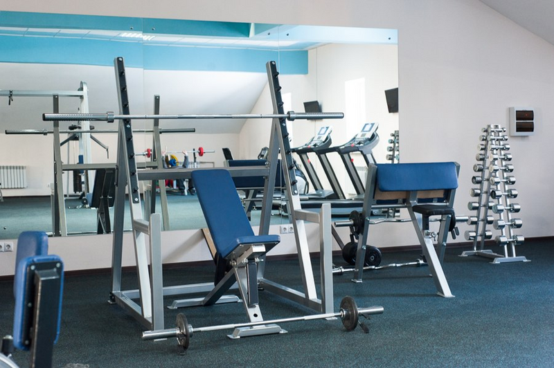 Профессиональный тренажерный зал с вежливыми инструкторами, полным комплектов тренажеров и гирь, с беговыми дорожками, велотренажерами, тренажерами лыжи, боксерским рингом и грушами для битья.
