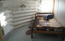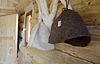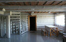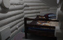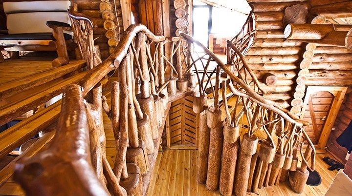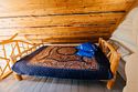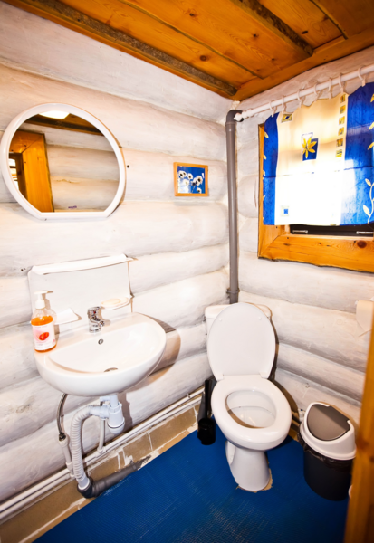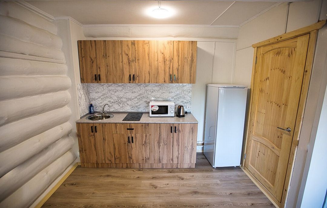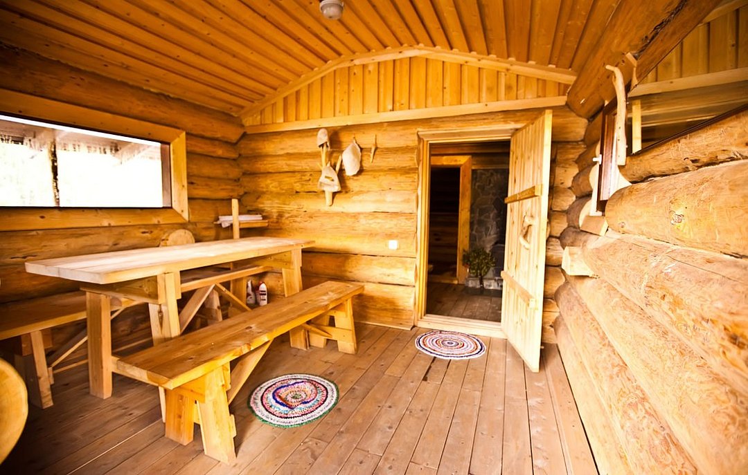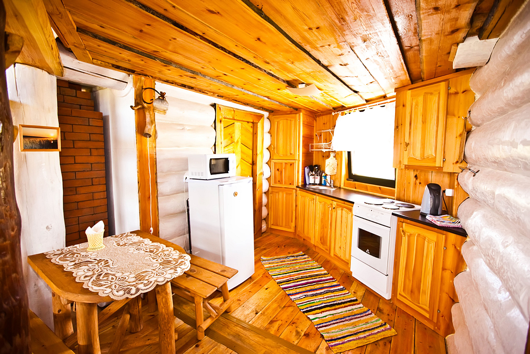 Первый этаж избы отведен под кухню со всем необходимым. Есть посуда, холодильник, СВЧ, плита, электрочайник. Рядом находится гостиная с телевизором. На первом этаже есть и настоящая дровяная сауна, в которой очень приятно расслабиться после эмоционального дня. Второй этаж избы отведен под спальни. В них установлены три двухместных кровати, есть одна одноместная.